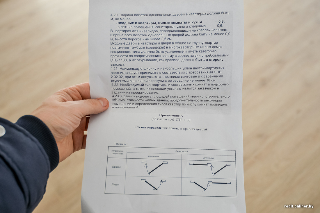 Пусть у нас в руках и неповеренная рулетка, но врать на 2—3 сантиметра она вряд ли станет. А мама Вероники извлекает на свет документ (СНБ 3.02.04-03), в котором четко прописано, что дверное полотно входной двери в квартиру должно быть шириной не менее 80 сантиметров.