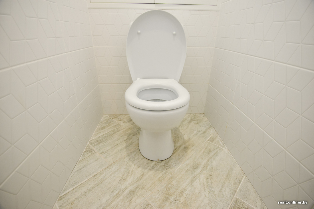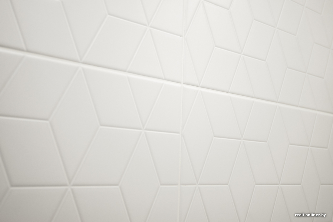 К тому, как уложена плитка, вопросов нет. Все сделано хорошо даже с учетом того, что материал не самый простой — рифленый. Сантехника также установлена профессионально, зазоры между стеной и умывальником минимальные.