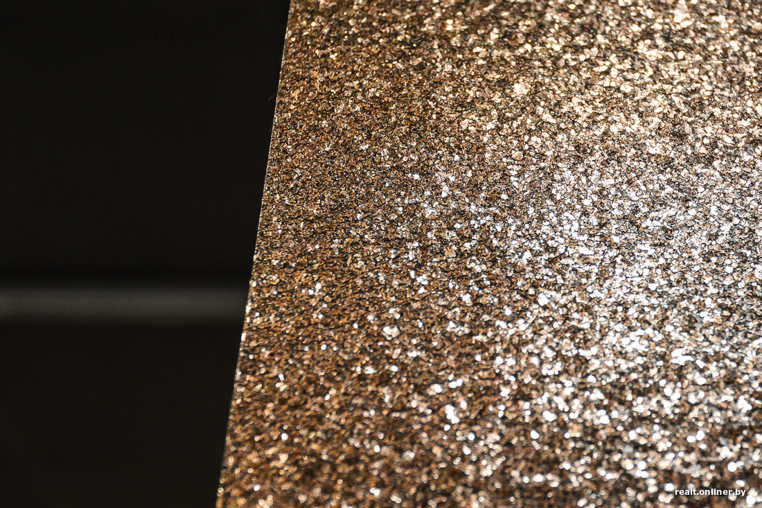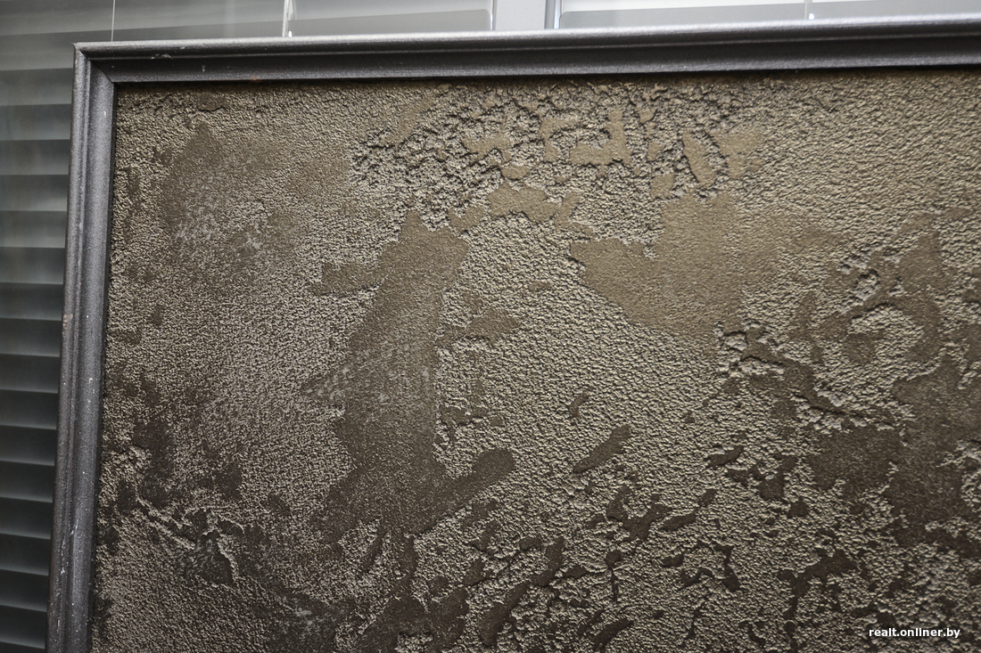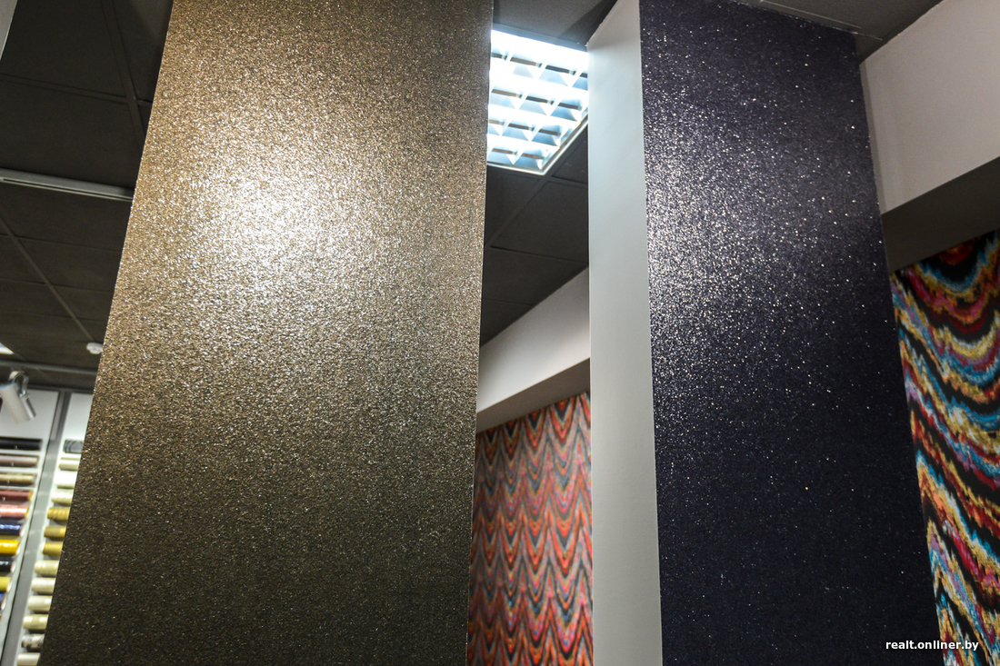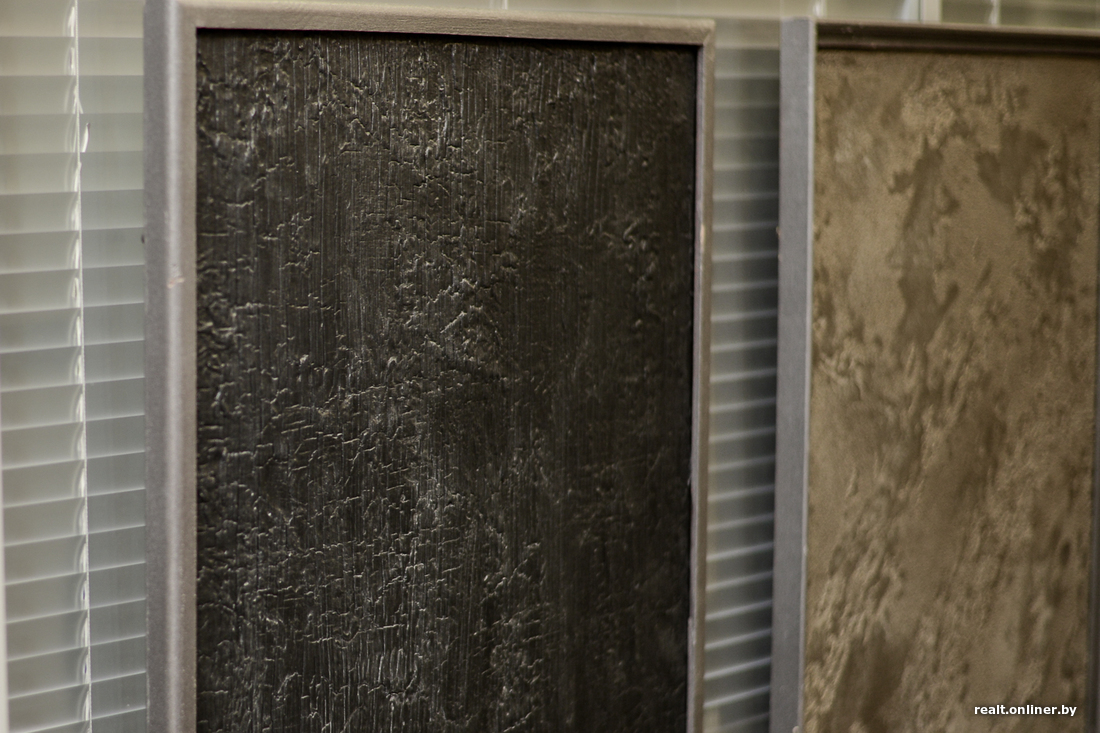 Среди вариантов находим имитацию жженого дерева, натуральных тканей, бетона, мраморной крошки... Такие позиции стоят от 40 до 60 долларов за квадратный метр, примерно столько же стоят работы.