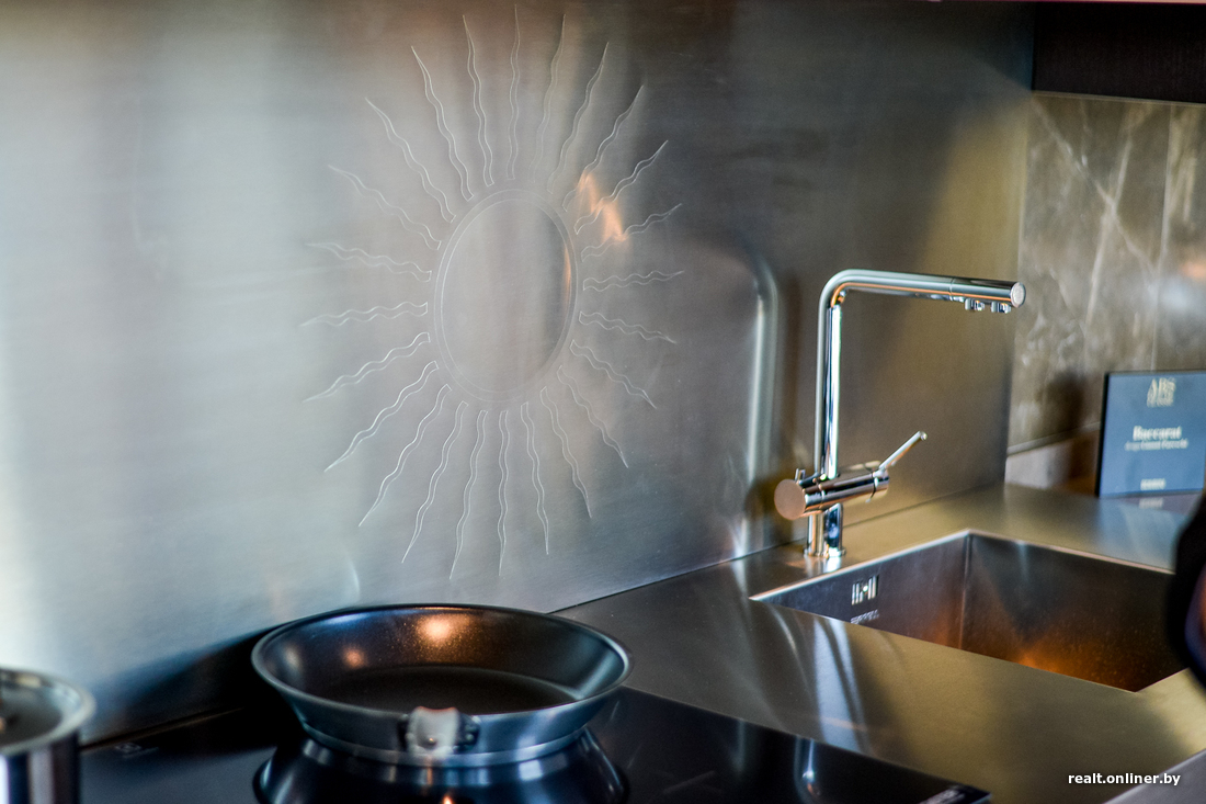 — Нержавейка, скинали, массив, начинка под СВЧ и духовой шкаф, сенсорное освещение, — вот и складывается цена, — объясняет продавец.