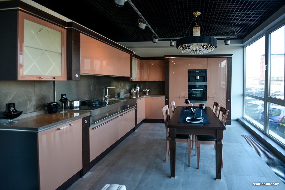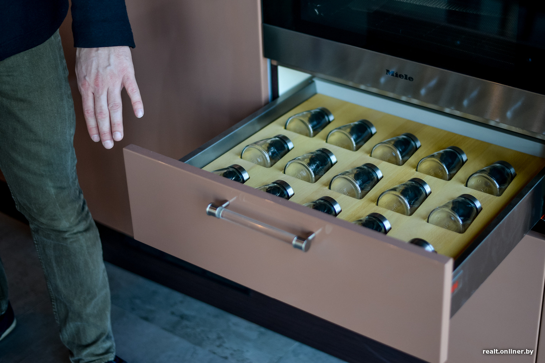 — Кухни такого класса могут стоить намного дороже. Это относительно бюджетный вариант. Посмотрите на толщину столешницы, на ножки, на то, как работают механизмы, — и все поймете. Это действительно стильно и удобно. Такие кухни обычно не собираются, а привозятся полностью готовыми.