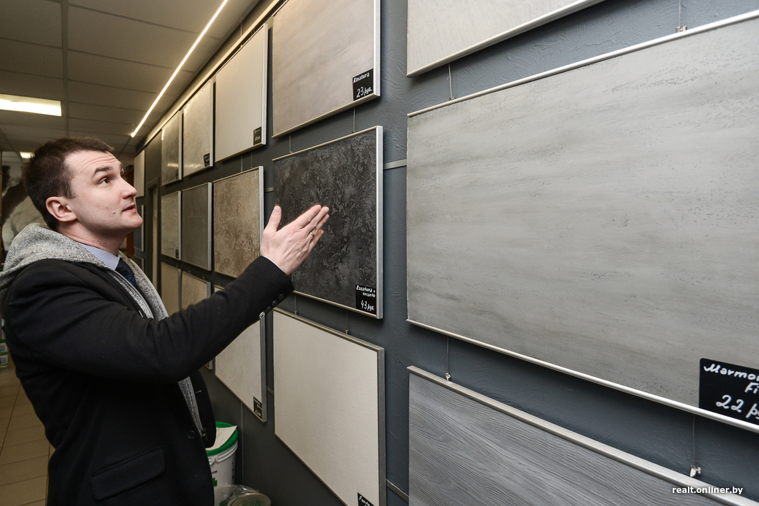 — Сегодня такая плитка безумно популярна. В каждом втором интерьере зарубежных дизайнеров можно встретить подобное решение. Его можно очень здорово комбинировать, например, с деревом, — показывает Дмитрий и ведет к панелям размером 3×1 метр и толщиной всего 3 миллиметра. Стоят они в районе $150 за «квадрат» в эквиваленте.