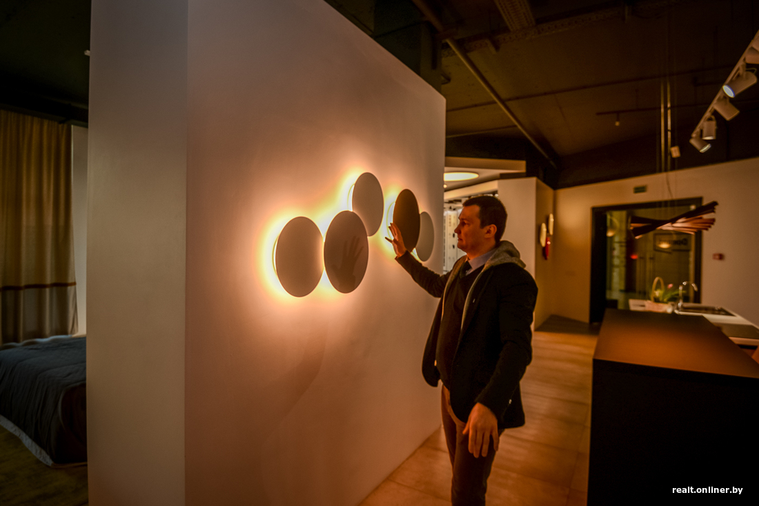 Для нашей выдуманной квартиры устанавливаем несколько групп света. На потолок вешаем круглые светильники. Они по большей части служат в качестве декора. В стенах скрываем парочку небольших ламп, устанавливаем светильник, напоминающий прожектор. За все это придется отдать $2500—3000.