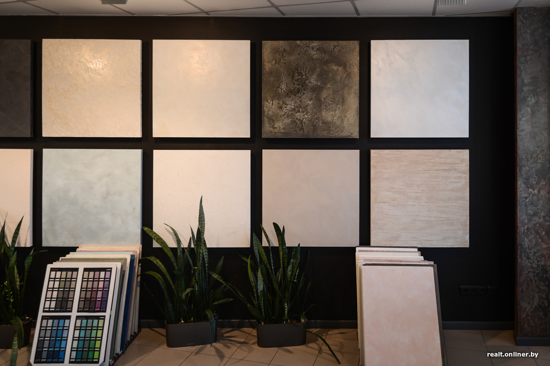 Для второй комнаты и кухни решаем выбрать декоративную штукатурку. В салоне есть и относительно недорогие позиции — по 10 рублей за квадратный метр, но нас они мало интересуют: мы пришли за изыском.
