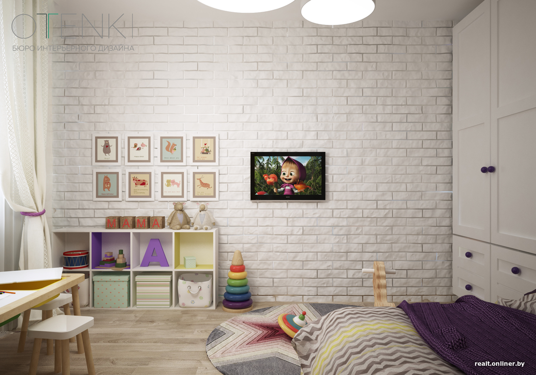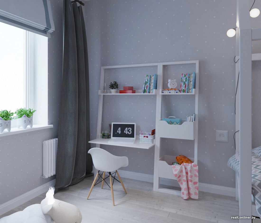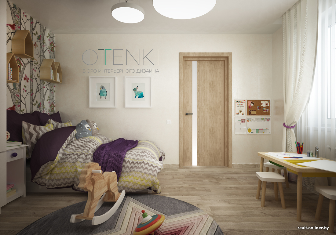 — Детская выполнена в мягких и деликатных тонах, ибо возраст у хозяйки комнаты очень нежный и трогательный. Размещаем все необходимое, в том числе шкаф для одежды и места для хранения игрушек, по пожеланию хозяев оставляем доступ к окну.