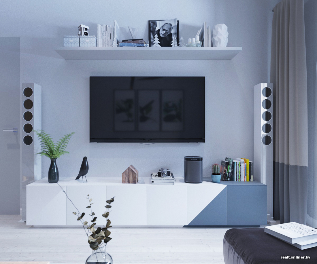 Гостиную разделили перегородкой на зону отдыха и рабочую зону и разместили здесь необходимые элементы мебели, в том числе буфет для «нарядной» посуды. Дверь в спальню светлая, сливается с пространством стены. Дизайнеры уверены: пространство остается легким и неперегруженным, сохраняя индивидуальность благодаря ярким акцентам.