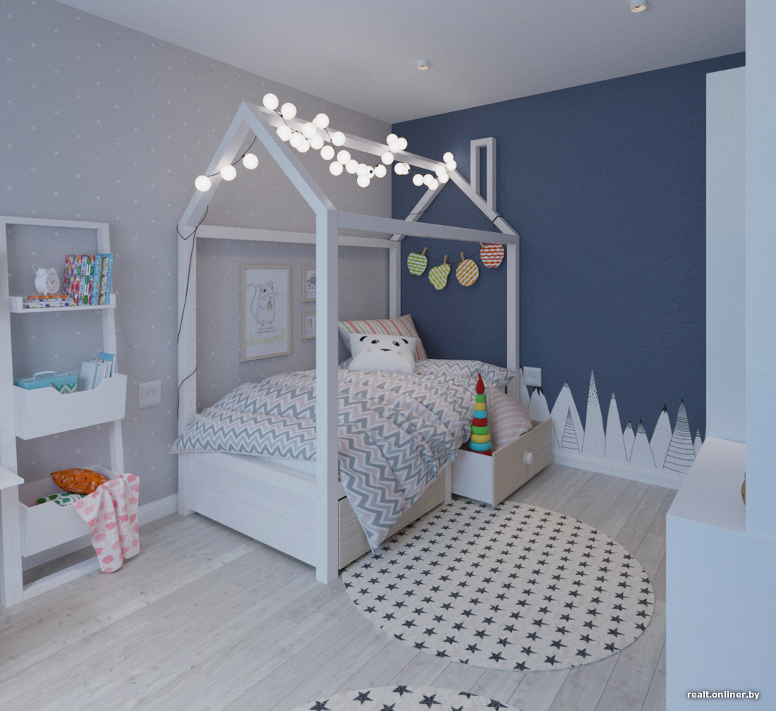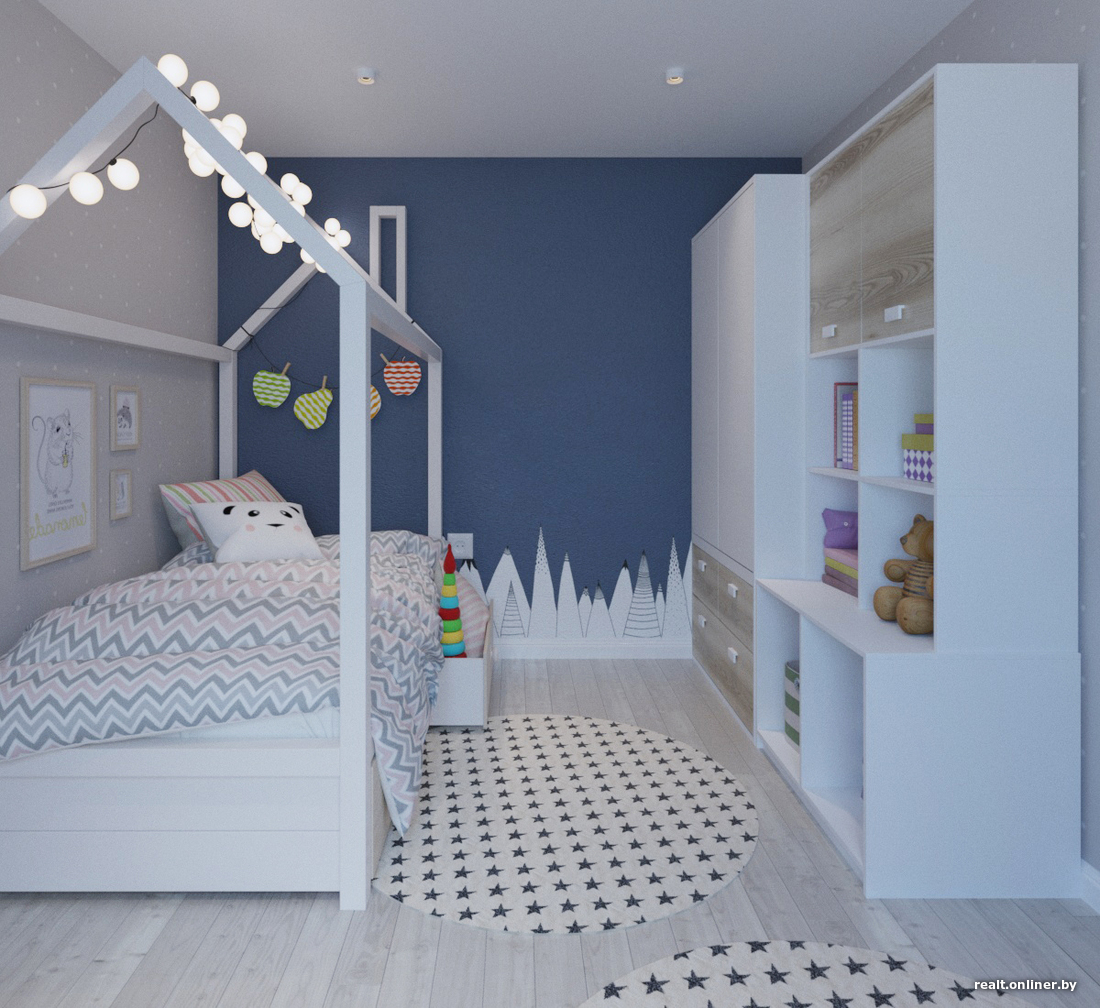 — Площадь детской — 10 кв. м. Стояла задача уместить в ней шкаф, полуторную кровать и детскую мебель. Так как у трехлетнего ребенка много игрушек, мы предложили открытый стеллаж для ящиков. В дальнейшем на его месте родители смогут поставить стол для учебы. Осталось много места для игр в центре комнаты.