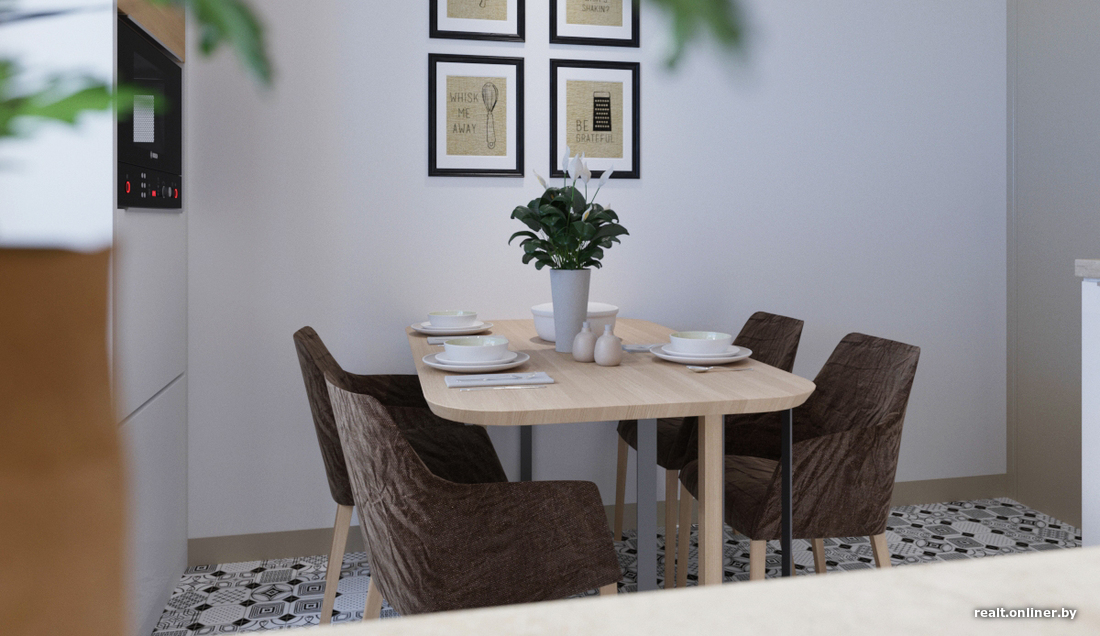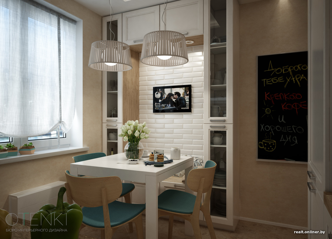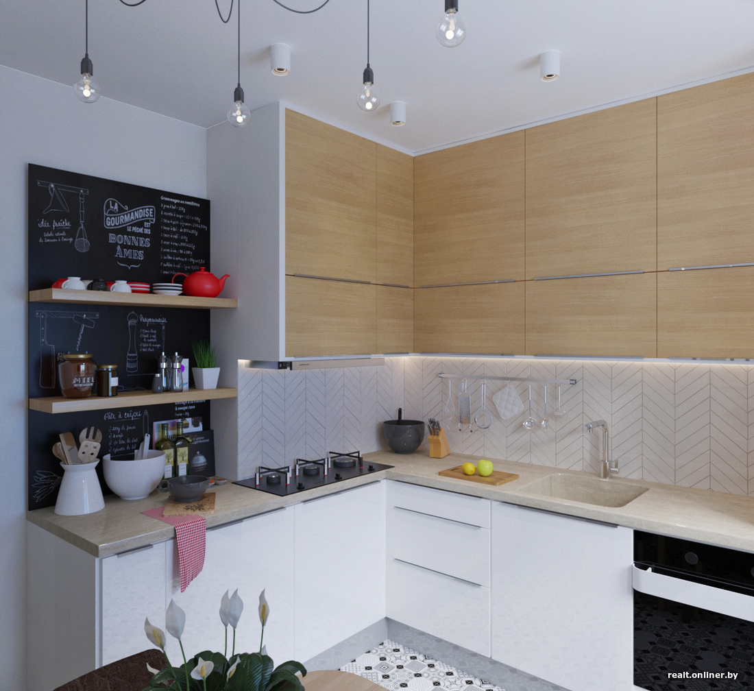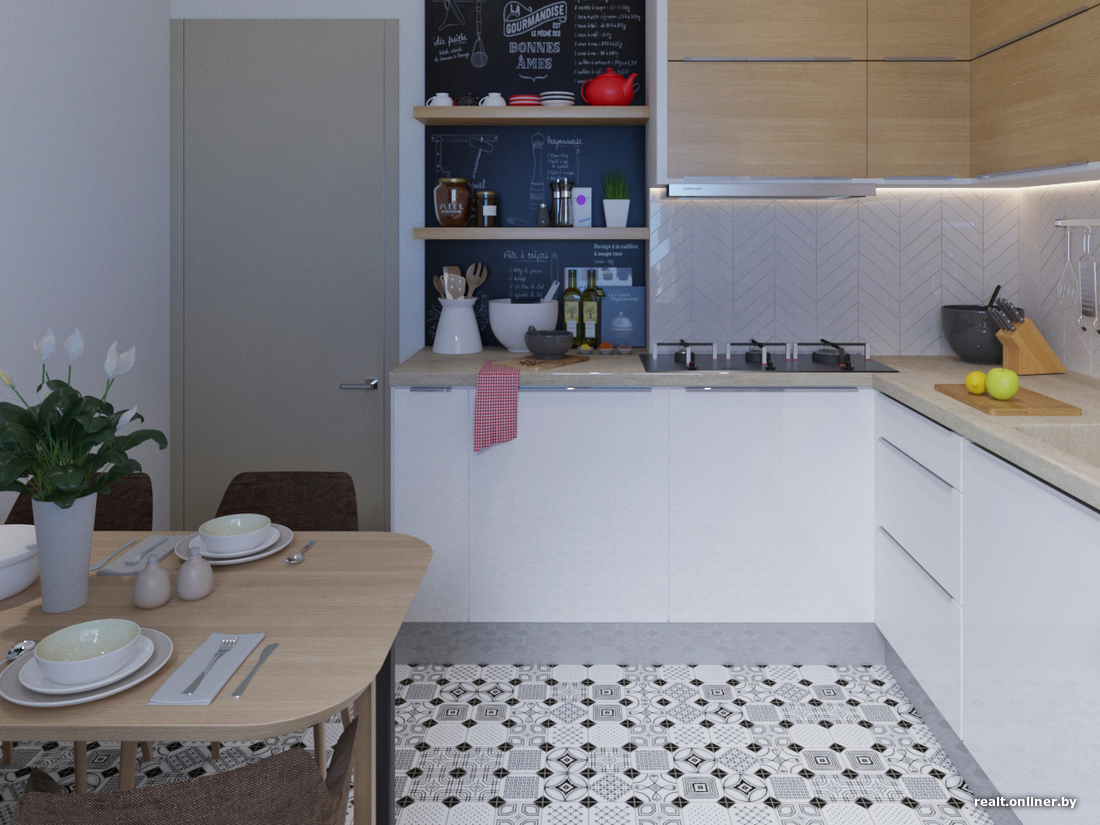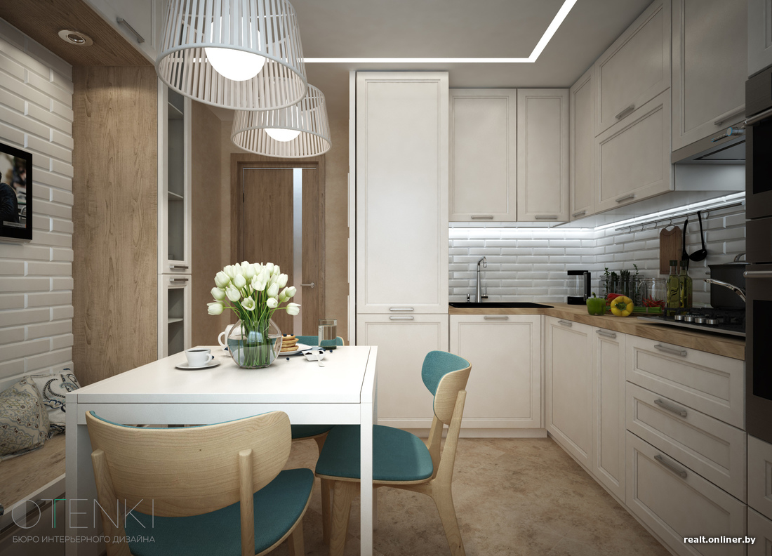 — Кухня получилась Г-образная. Секция для хранения посуды и сиденья разместились возле стола. У входа осталось место для небольших ниш, но, думаем, каждая хозяйка найдет им применение. По нашему мнению, кухня получилась функциональная и уютная, здесь можно проводить долгие вечера за ароматным чаем с печеньем.
