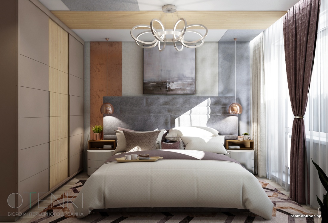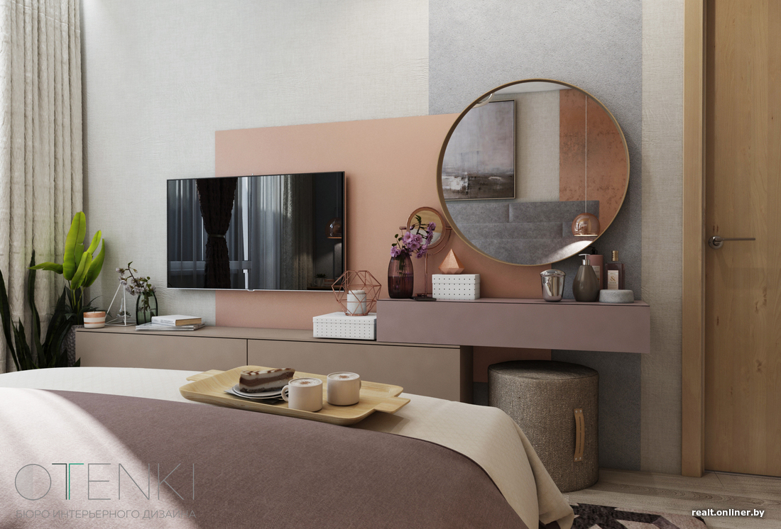 Нас вдохновляла весна, очень хотелось привнести в интерьер легкости и нежности. В спальне мы использовали цветовую гамму пудровых оттенков, бронзы и серой дымки. Спальня должна оказывать убаюкивающий эффект после ритмичного рабочего дня. Нашлось место и для мечты хозяйки — туалетного столика. Большой и вместительный шкаф даст возможность убрать все необходимые вещи.