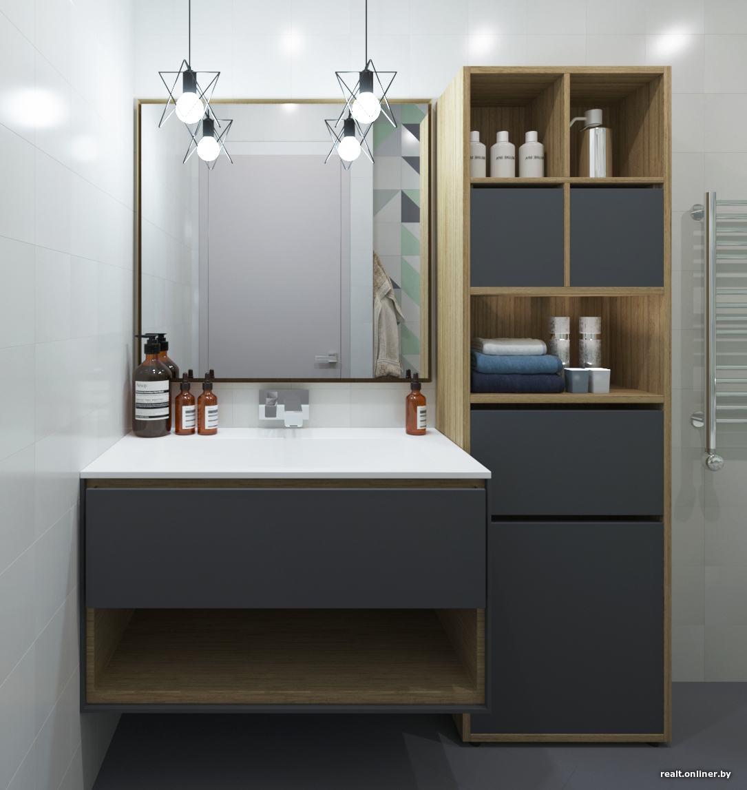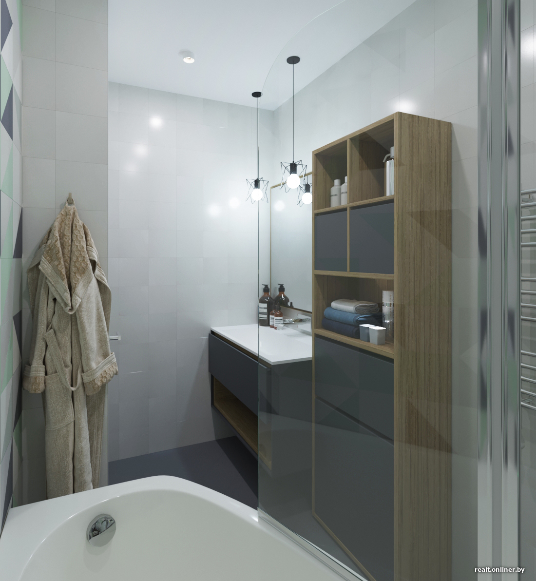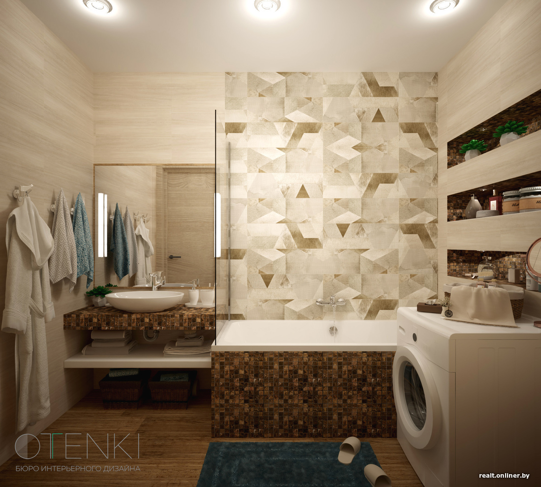 — Мы решили продлить ванную комнату в коридор, тем самым избавившись от ее стандартной планировки. Разместили ванну длиной 170 сантиметров, стиральную машину. Осталось место для ниш и небольшой закуток под полотенцесушителем для бытовых мелочей.
