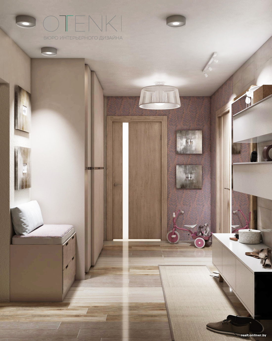 — Итак, первый вариант. В прихожей справа непонятны закрытые полки, вешалки смотрелись бы там куда лучше. Осталось загадкой, зачем на кухне стеклянные столбы. В спальне порадовали туалетный столик и успокаивающая цветовая гамма. В гостиной неприятно удивили «перегородка» и тяжелый фиолетовый цвет. Имитация под кирпичную стенку в детской более уместна в прихожей. Решение с увеличением санузла мне очень понравилось. Единственное, хотелось бы чуть больше яркости.