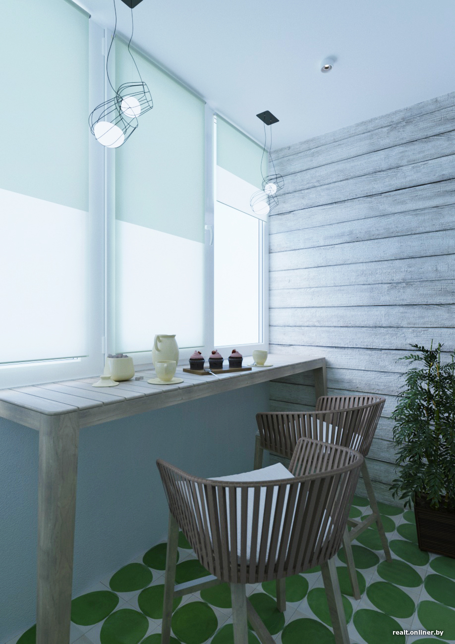 На балконе размещаем необходимые для всех хозяек места хранения и зону отдыха со столом, выполненную с акцентом на экотематику. Используем яркую плитку и теплый пол.