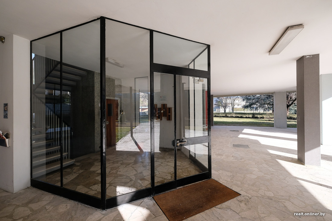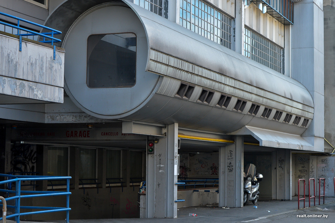 Посторонние же, не обращая внимания на запрещающие таблички, могут подняться на крышу здания. Под стеклянными фонарями — подземная парковка, повторяющая форму жилой единицы, а во двор выходят 82 квартиры (одно- и двухуровневых) площадью от 80 до 120 квадратных метров, в которых должны были проживать молодые сотрудники Olivetti.