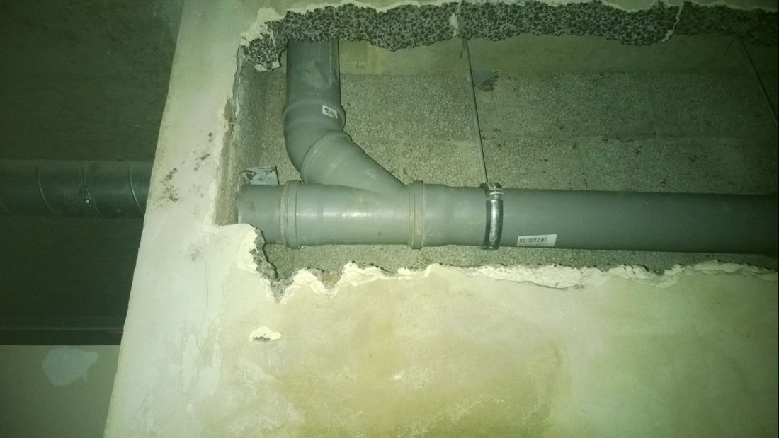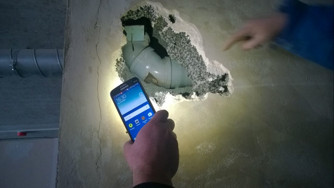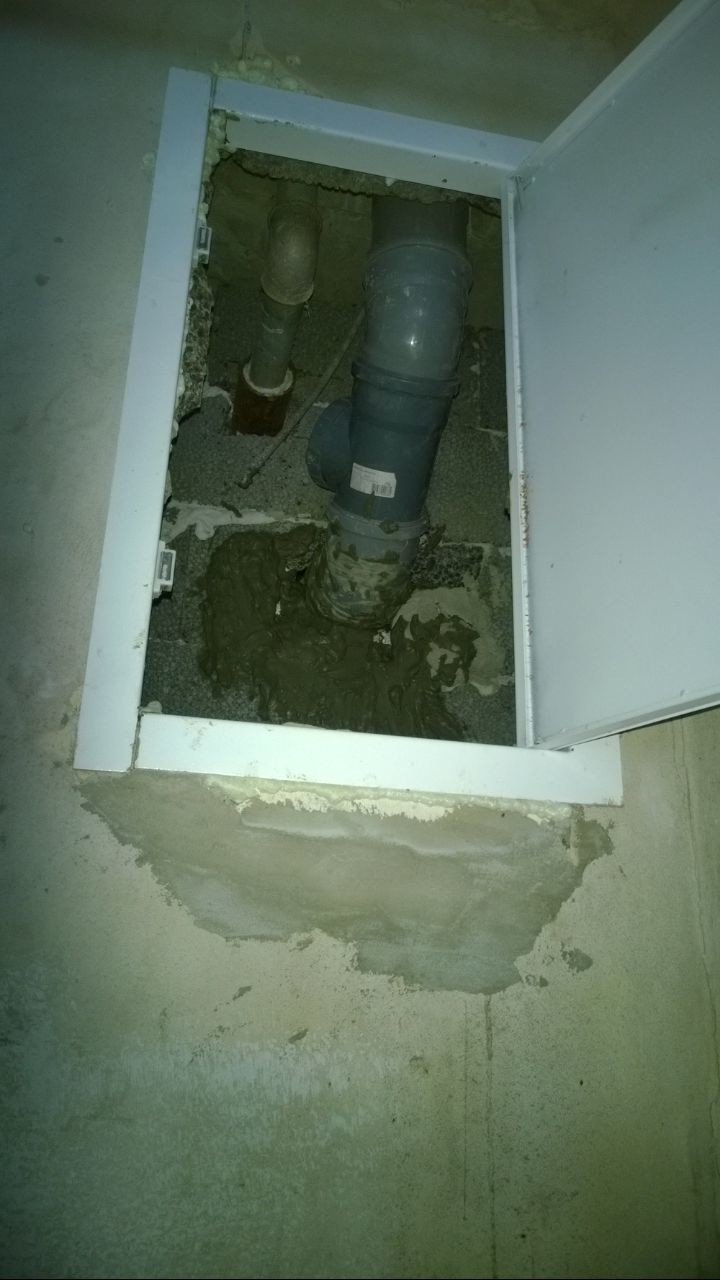 — Один из владельцев недавно узнал, что в стенке его магазина проходит труба. Увидели только когда стену разбомбили. С ноября 2016-го по январь 2017 года трижды происходил засор канализации в одном и том же месте. 16 января был составлен дефектный акт и было принято решение вскрыть зашивку стояка для определения положения канализационной трубы. После демонтажа стены стало ясно, что засор образовывается в угловом колене стояка, при этом отсутствуют люки ревизии для прочистки и обратный клапан. Так как канализация забивается часто и стену придется часто разбирать, владельцы помещения сами сделали люк, чтобы иметь доступ.