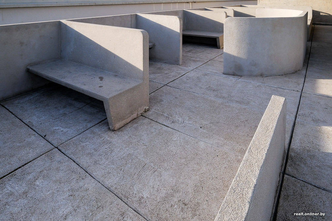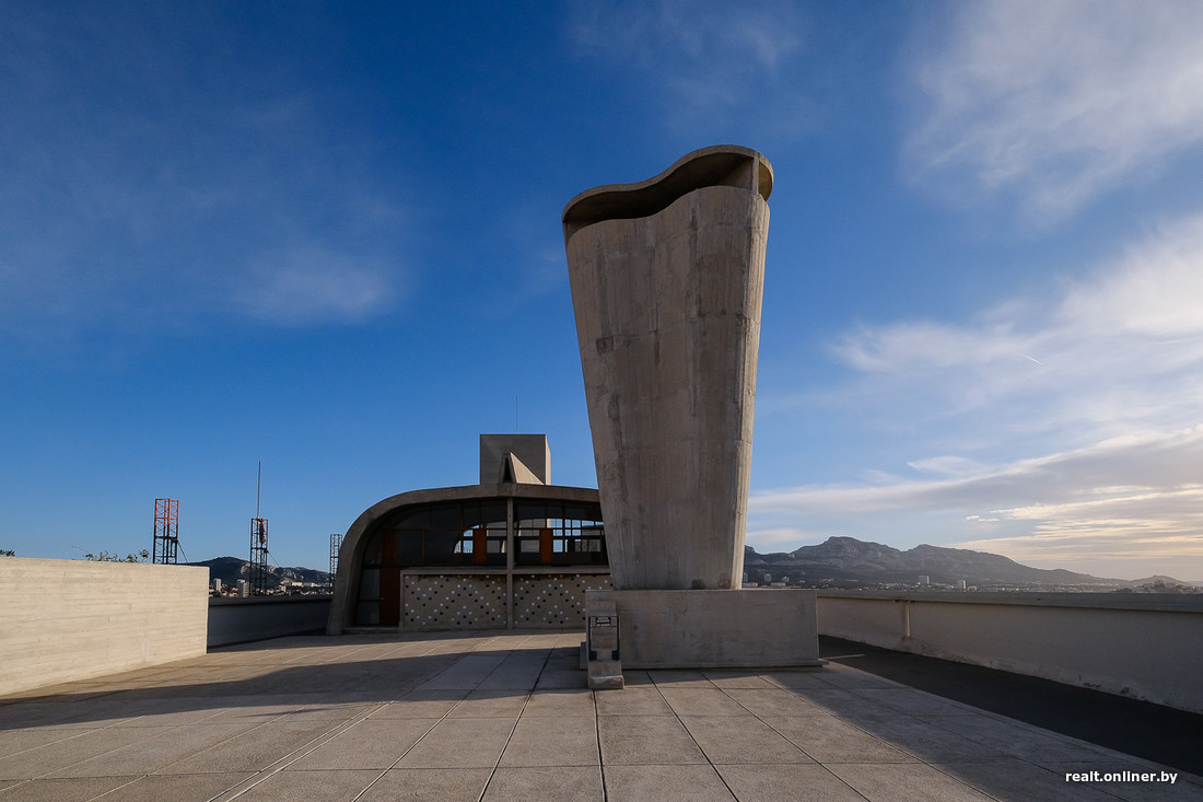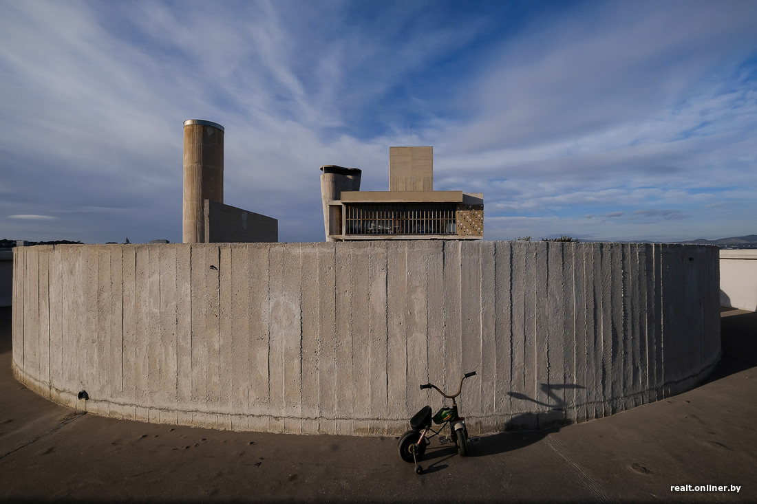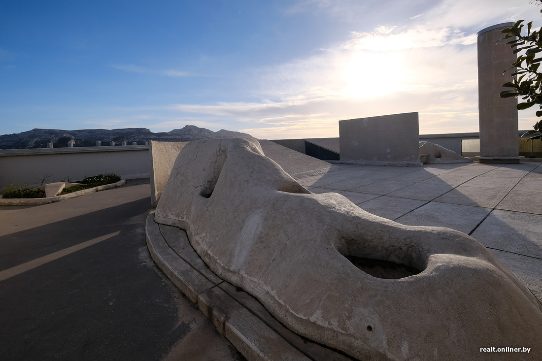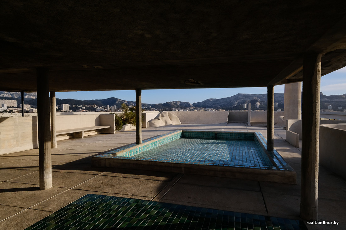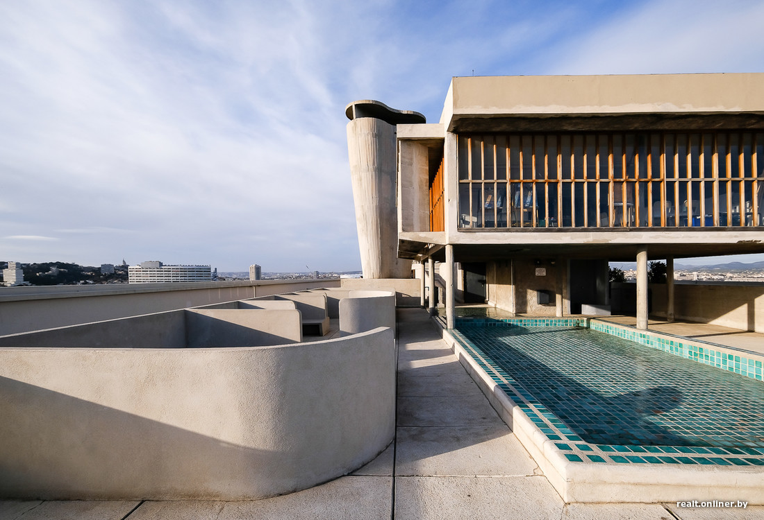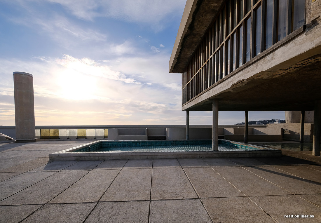 Нормальный человеческий быт, конечно, был невозможен без свежего воздуха. Корбюзье предусмотрел и это, использовав еще одну «отправную точку» своей архитектуры — плоскую крышу-террасу. Обширное (благодаря размерам «Жилой единицы») пространство позволило разместить здесь детский сад с плескательным бассейном, спортивный зал для взрослых с беговой дорожкой по периметру, эстраду и кафетерий. Здесь жители могли загорать и, возможно, самое главное, наслаждаться прекрасным видом на окружающий город.