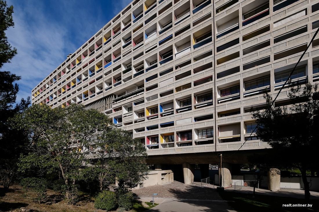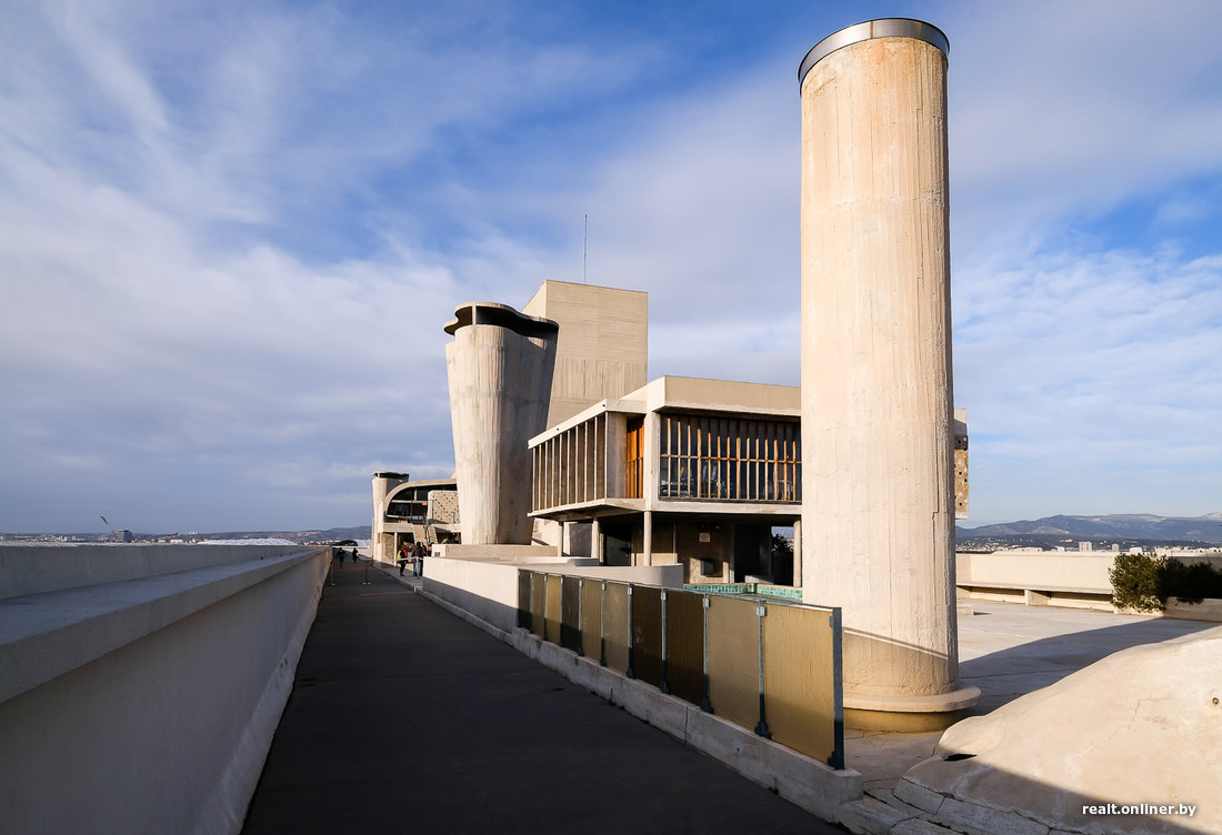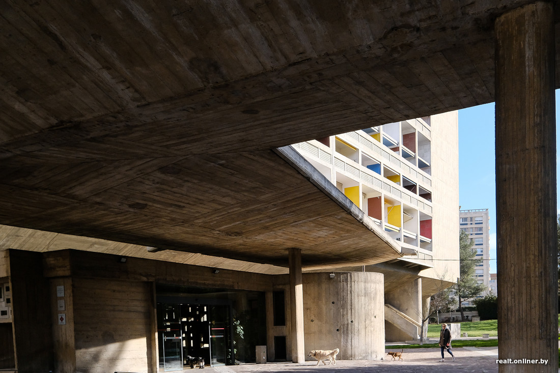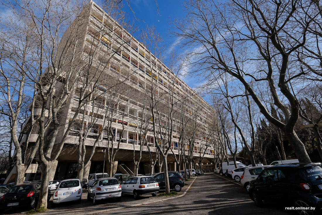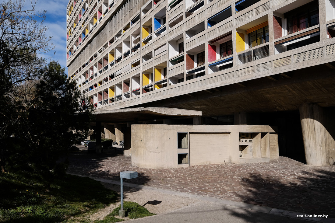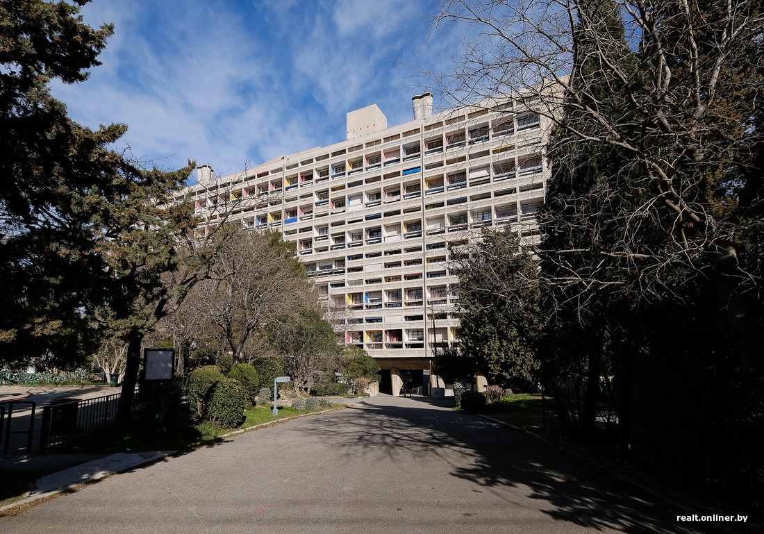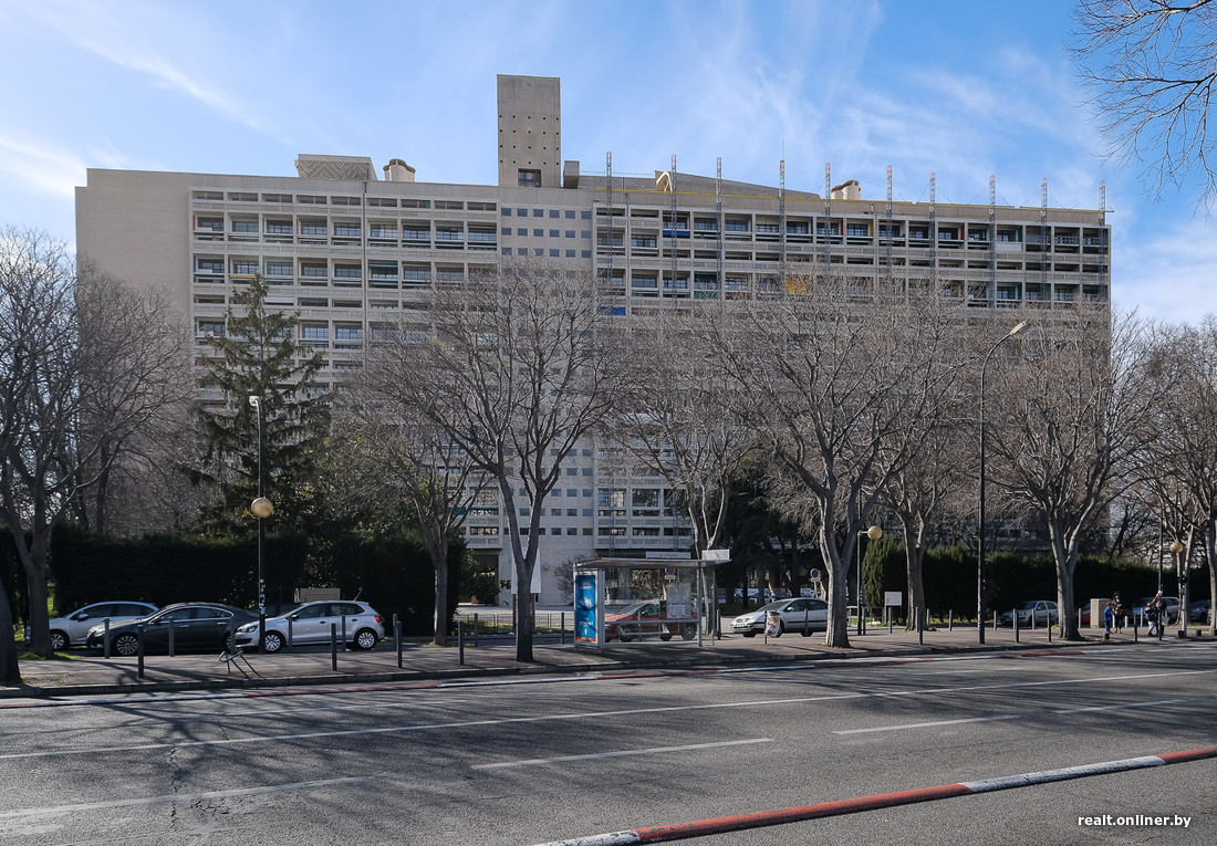 В 1952 году после пятилетнего строительства 17-этажное здание на марсельском бульваре Мишле наконец-то было сдано в эксплуатацию. Это действительно было нечто невиданное ранее. Бетонный каркас, установленный (естественно!) на массивные ноги-опоры, был, как стеллаж бутылками, заполнен модулями двухэтажных квартир-дуплексов. В плане они напоминают букву «Г» и состоят из двухсветной (на оба этажа) гостиной, выходящей на лоджию с солнцезащитным козырьком, и низкой части со спальнями, проходящей через все здание до маленького балкона на противоположном фасаде дома.