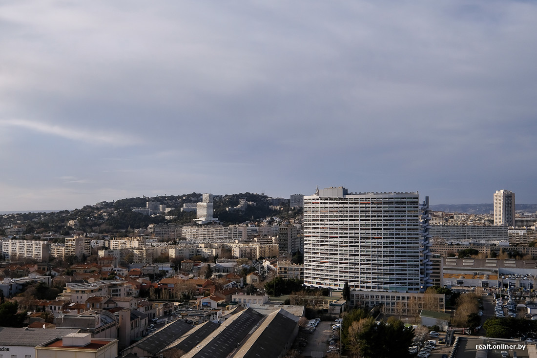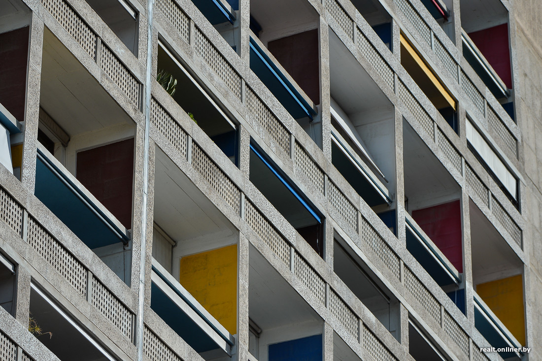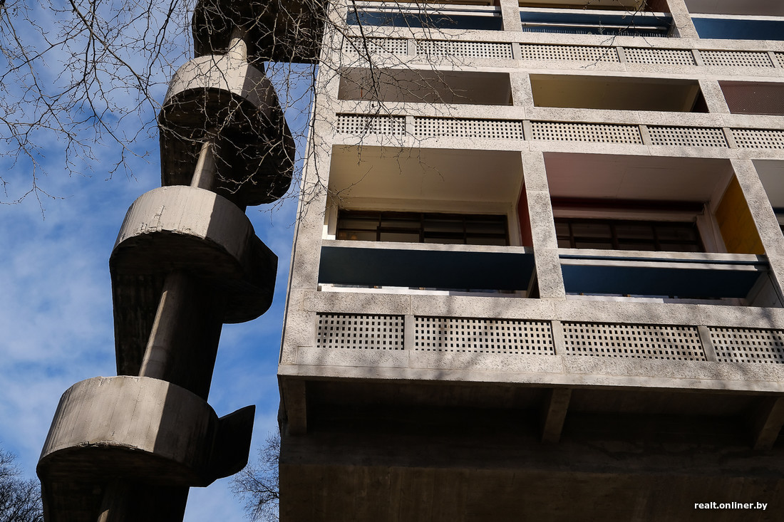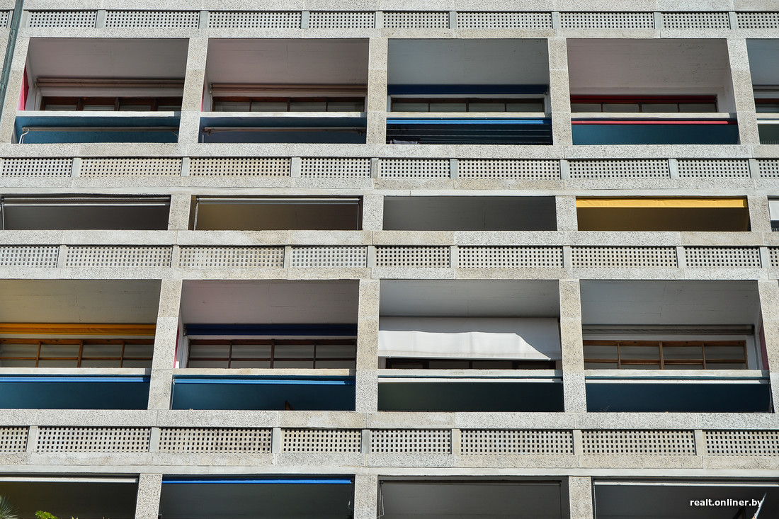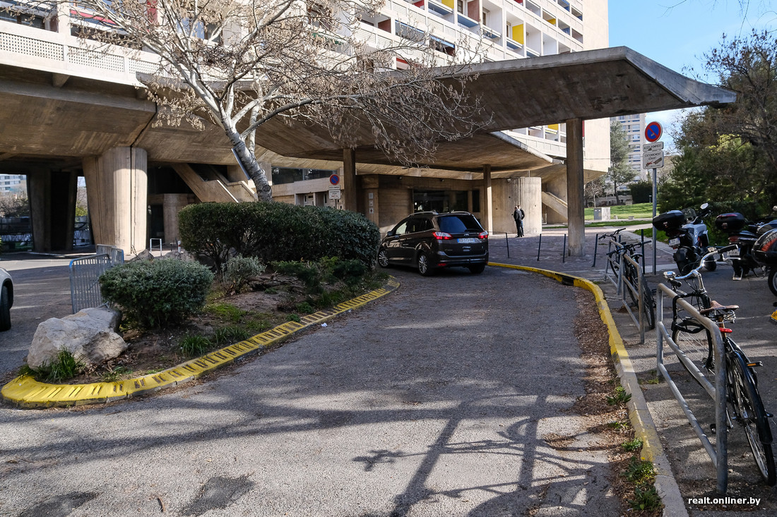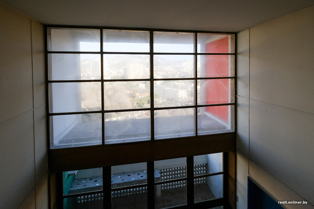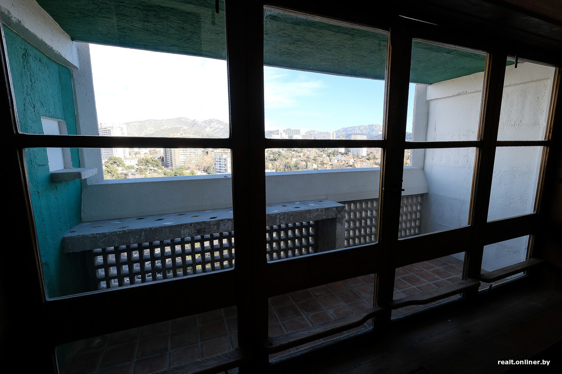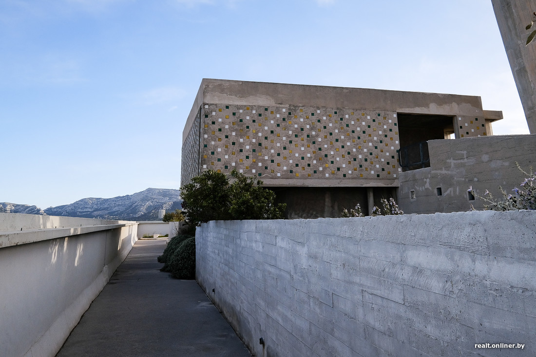 В 1952 году после пятилетнего строительства 17-этажное здание на марсельском бульваре Мишле наконец-то было сдано в эксплуатацию. Это действительно было нечто невиданное ранее. Бетонный каркас, установленный (естественно!) на массивные ноги-опоры, был, как стеллаж бутылками, заполнен модулями двухэтажных квартир-дуплексов. В плане они напоминают букву «Г» и состоят из двухсветной (на оба этажа) гостиной, выходящей на лоджию с солнцезащитным козырьком, и низкой части со спальнями, проходящей через все здание до маленького балкона на противоположном фасаде дома.