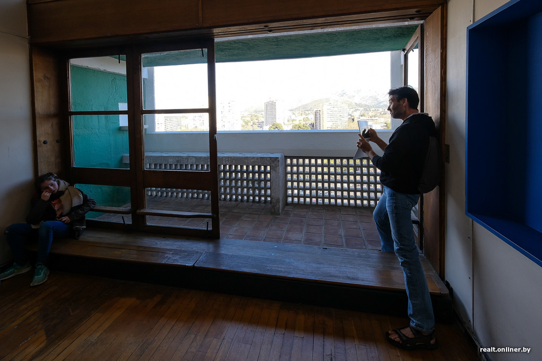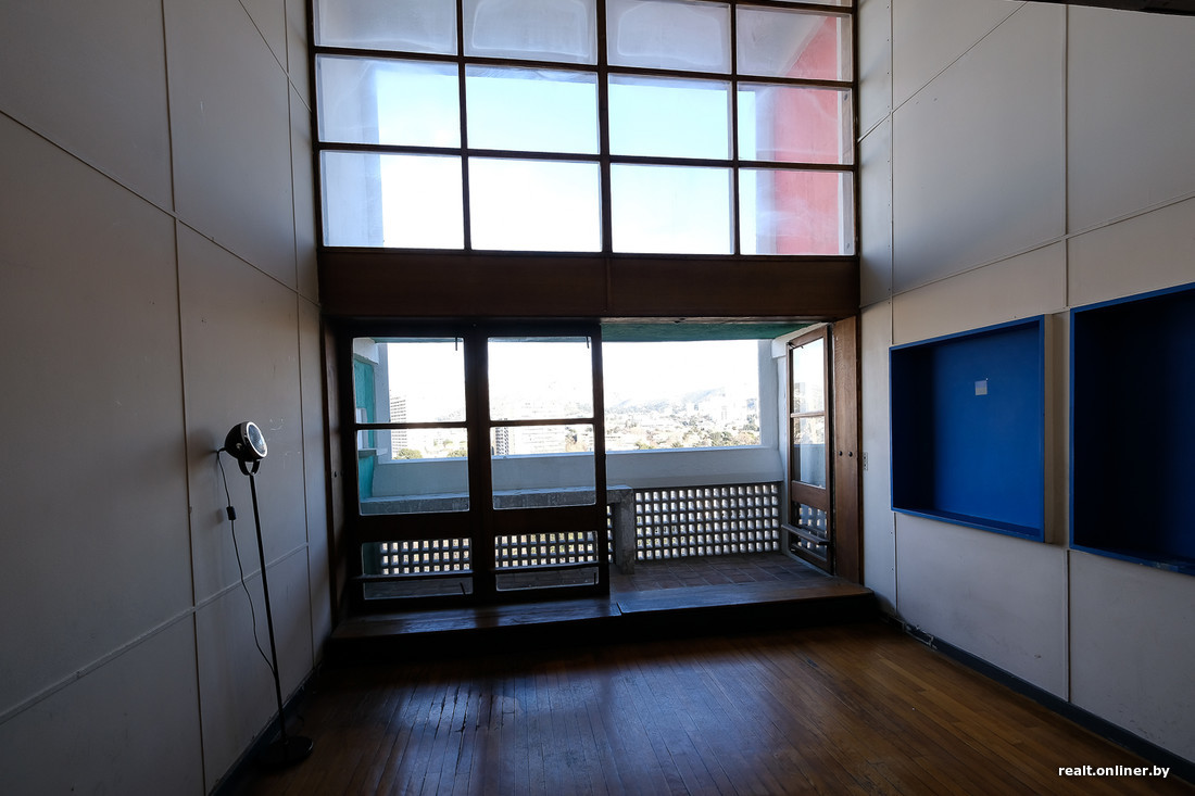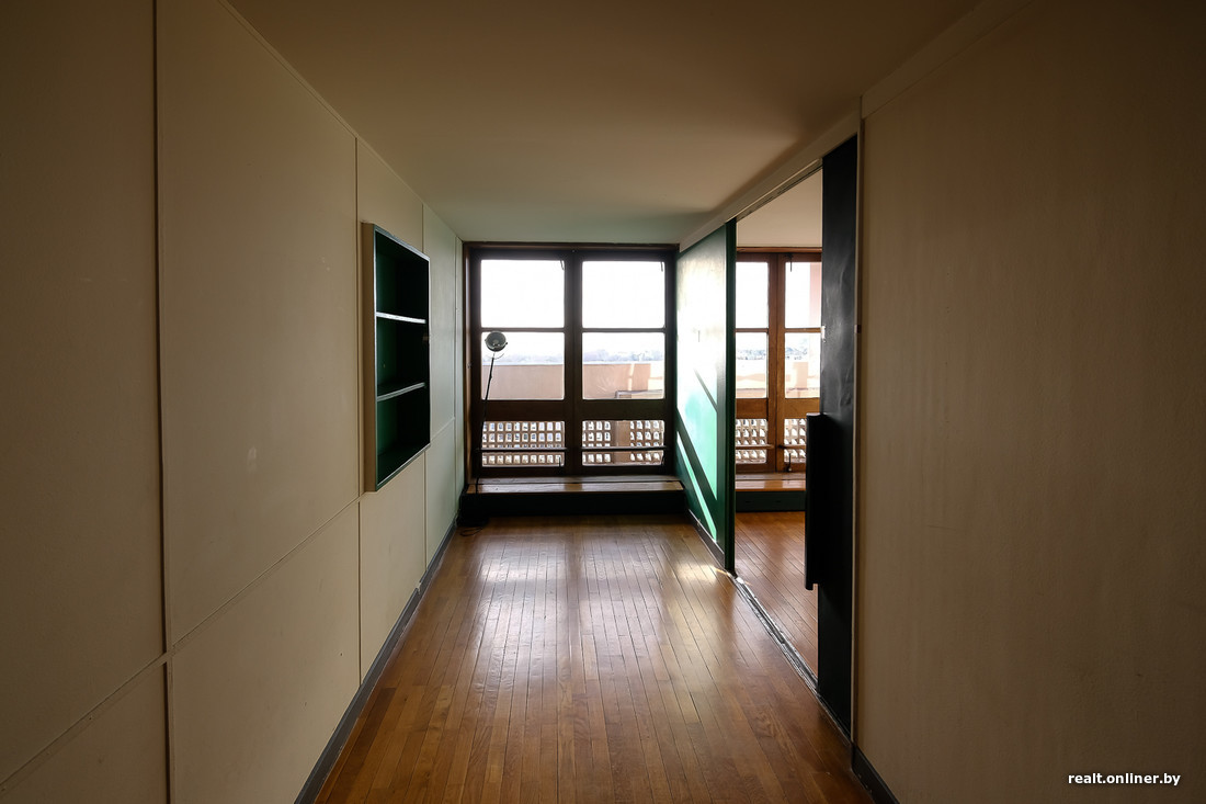 Внутри Корбюзье смог разместить 337 дуплексов 23 различных типов, рассчитанных на проживание около 1600 человек. Один из них сейчас доступен всем желающим для осмотра. У входа за прихожей размещена небольшая кухня, оснащенная при сдаче дома в эксплуатацию типовым оборудованием. Она переходит в большую гостиную, занимающую всю высоту дуплекса, — «Бассейн света», как называл ее Корбюзье. Раздвижная стеклянная стена отделяет квартиру от лоджии.