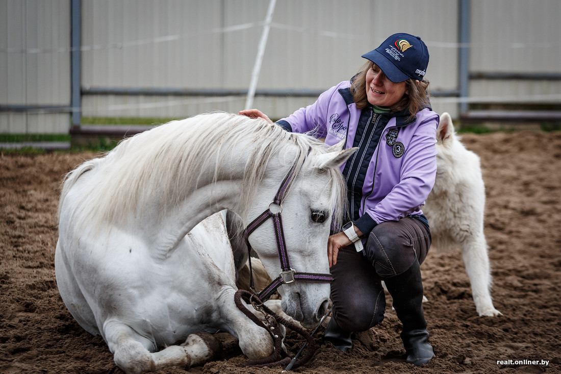 Алена выводит свою гордость — жеребца Вальса. Белый арабский скакун на людях выгибает спину и показывает себя во всей красе. Он один из главных «актеров» в «лошадином театре» — одном из проектов, организованных Аленой и ее командой.