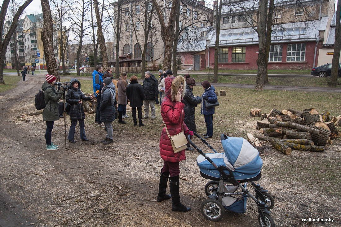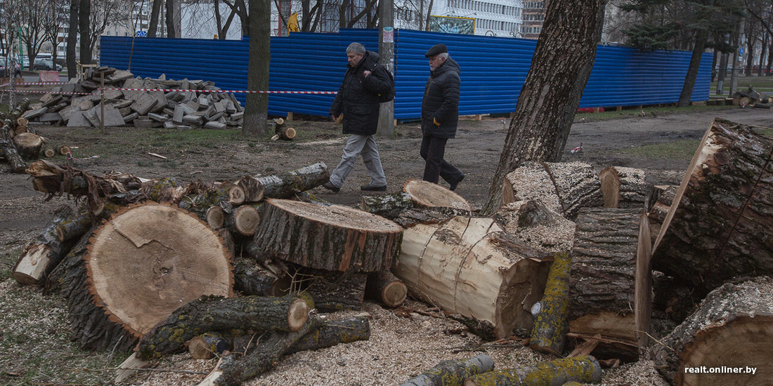 Эти объяснения не устраивают местных жителей. «В пятницу приехала техника, появился забор, никаких паспортов объекта не было, — рассказал Onliner.by минчанин Павел, проживающий в доме неподалеку от бульвара. — Мы составили коллективное обращение, под которым подписалось 130 человек, с просьбой разъяснить жильцам, что именно строят, почему вырубают деревья — как здоровые, так и больные. Позже самостоятельно в сети мы нашли информацию: уничтожат 37 деревьев, из них два здоровых, одно в удовлетворительном состоянии, остальные — больные. Про строительство в официальных источниках — ни слова. В новостной ленте обнаружили сообщение о планах по строительству „объекта для проведения массовых мероприятий“. Мы против возведения такого объекта».