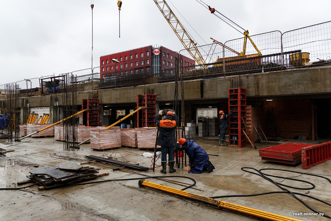 — Тут у нас сердце и мозг метрополитена, — тянет руку из котлована наш экскурсовод. — Раньше служебные помещения «загонялись» под землю, а для отдыха сотрудникам предоставлялись арендные квартиры вблизи станций. Сейчас же в целях экономии бюджета было решено возвести отдельное строение. Там будут даже комнаты отдыха, где персонал сможет остаться до утра после ночной смены, а потом поехать домой. Сегодня в Минске около пяти тысяч сотрудников метро, а после запуска третьей линии их станет еще больше, поэтому постройка таких сооружений более чем оправданна.