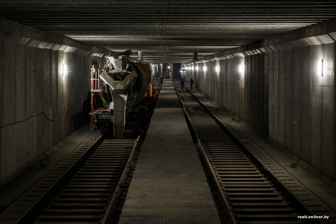 Один из тоннелей, который ведет к станции «Юбилейная площадь», практически готов. Это и есть результат применения «Алеси» — проходческого щита французского производства размером с поезд. Он был заказан специально для строительства третьей ветки. Стоил немало — почти $12 млн, зато с помощью такого «механического червя» бурить тоннели выходит намного быстрее.