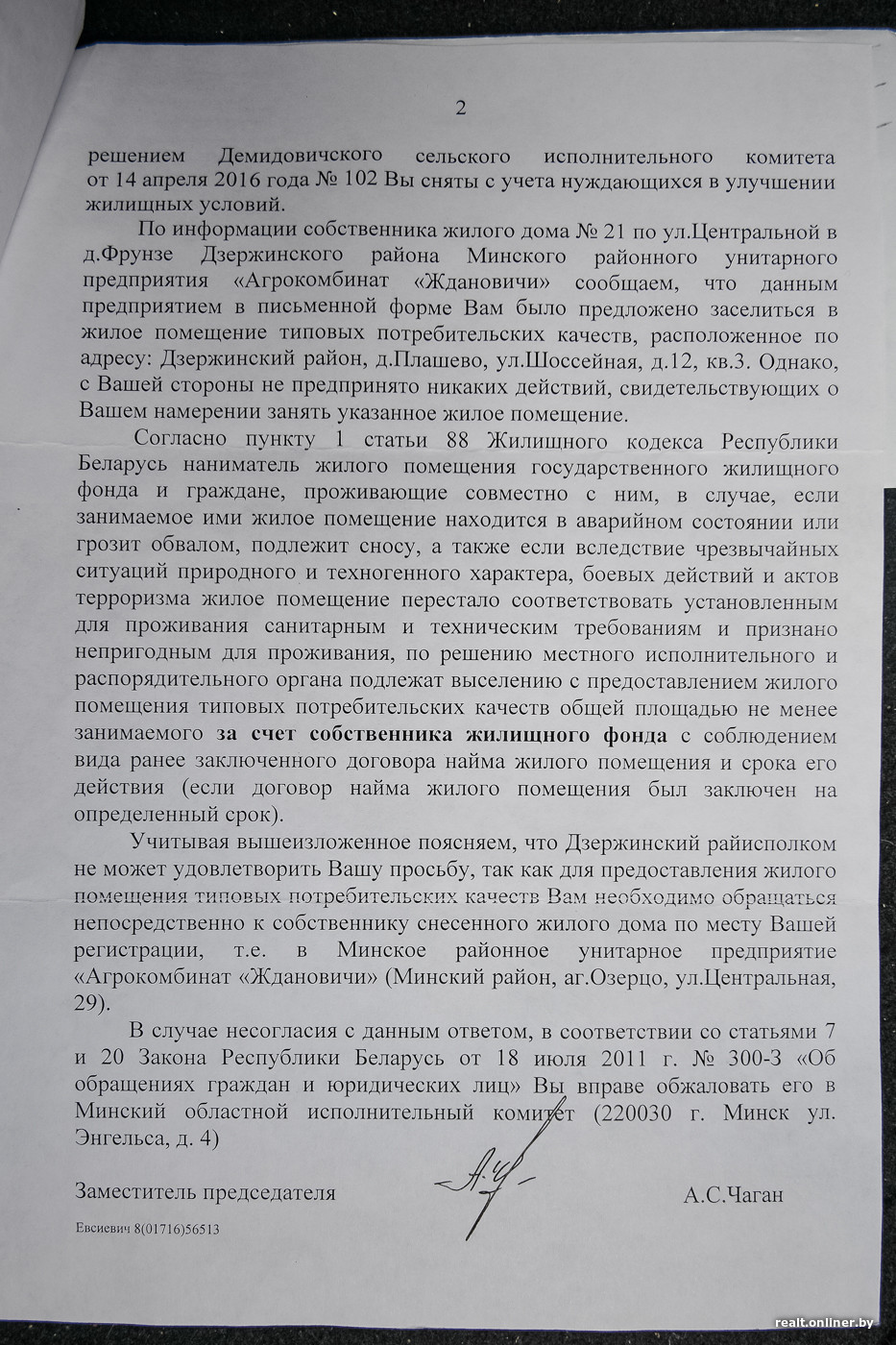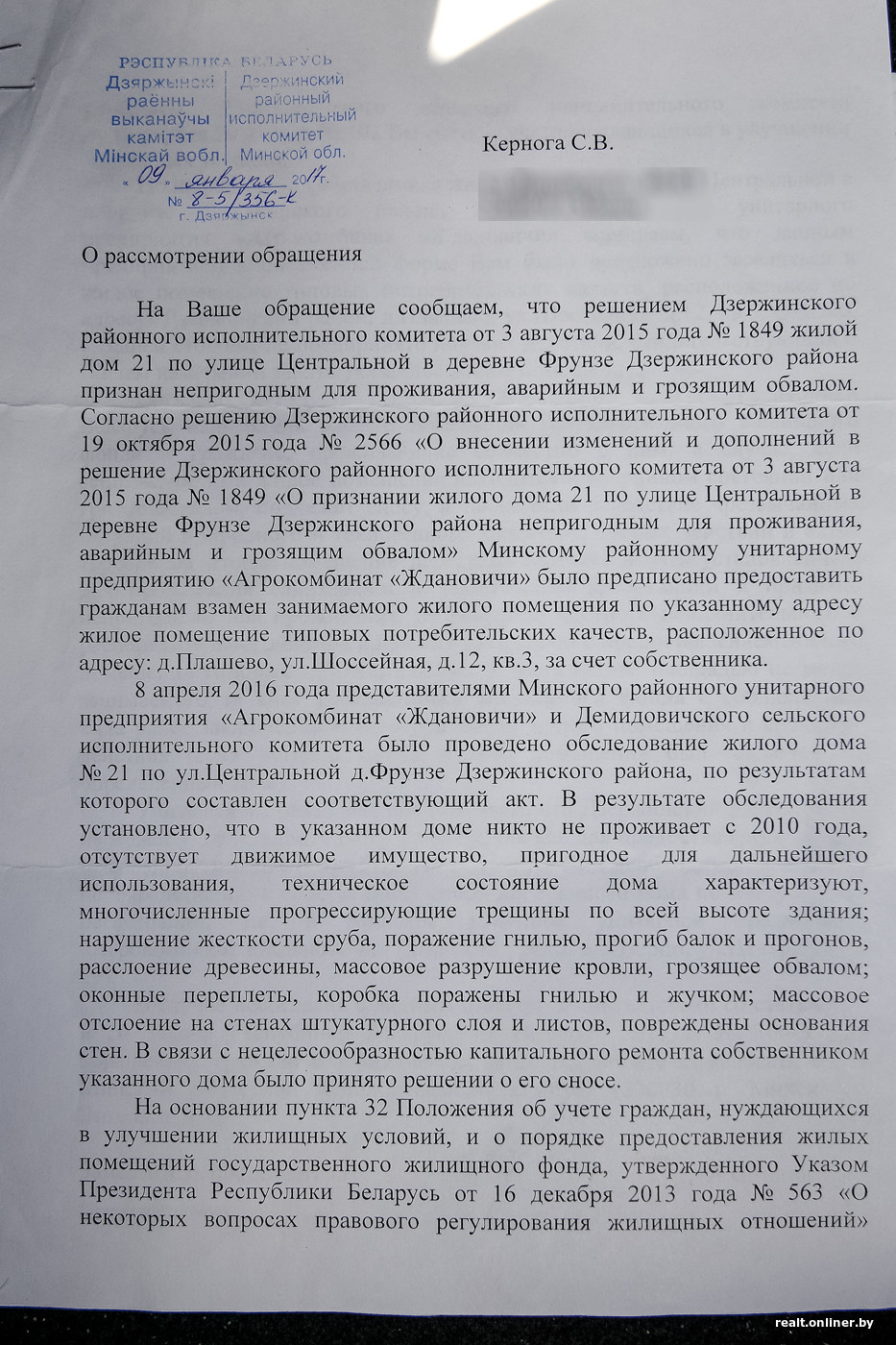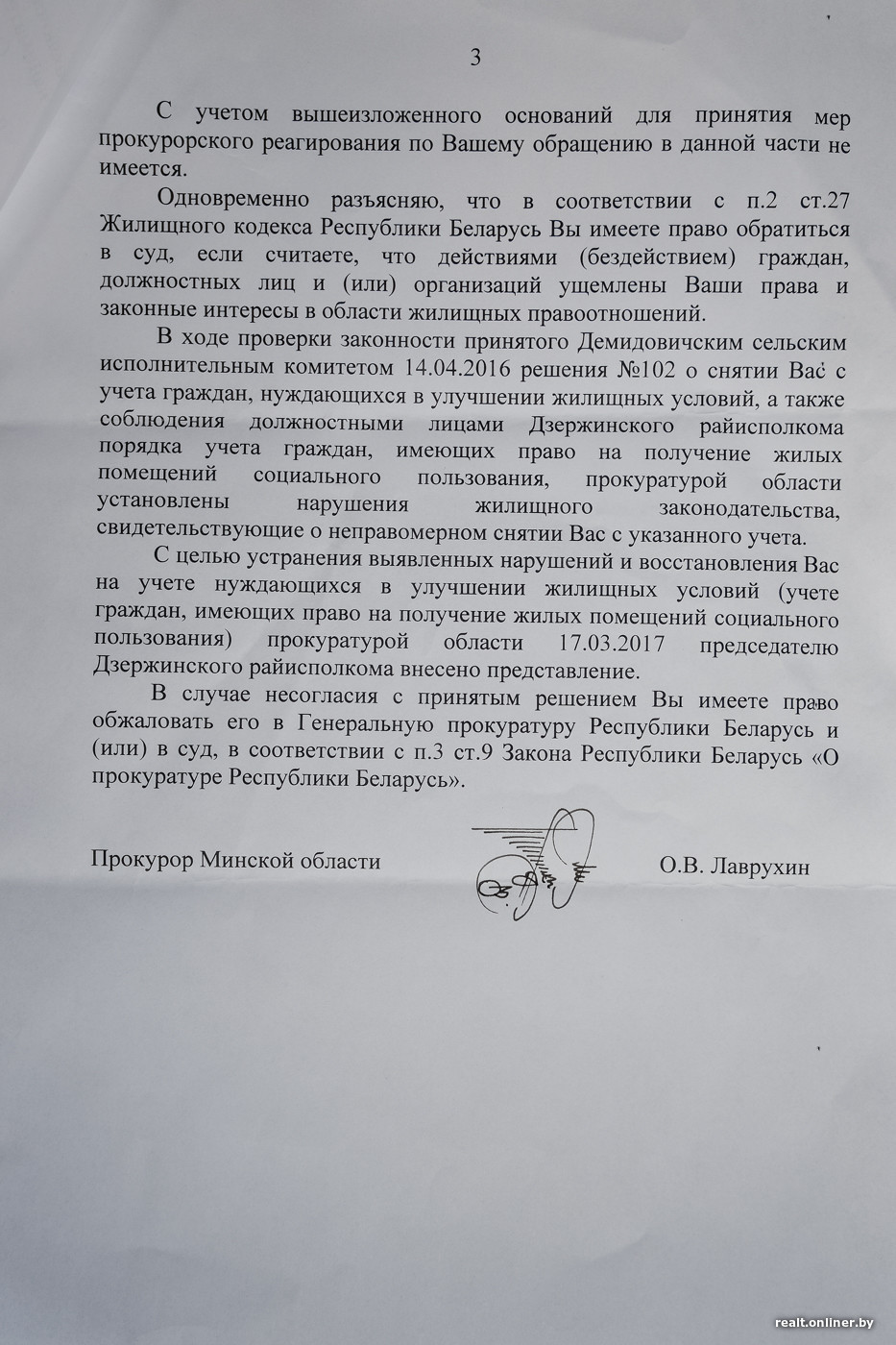 В Демидовичском сельсовете Дзержинского района, где Сергея исключили из очереди нуждающихся в улучшении жилищных условий, так видят ситуацию: