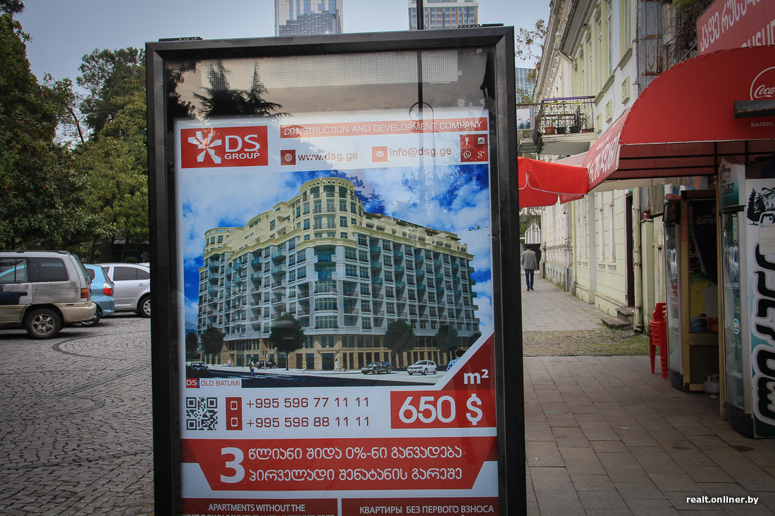 Продажа новостроек в Батуми — великая цель наряду с развитием туризма. Пройдясь по городу, можно насчитать десяток рекламных билбордов. Что удобно — возле каждой новостройки есть плакат с ценой метра. Застройщики здесь — великие маркетологи, указывают минимальную стоимость метра или минимальный месячный взнос, чтобы завлечь дешевизной. $350 за метр? Беру две!