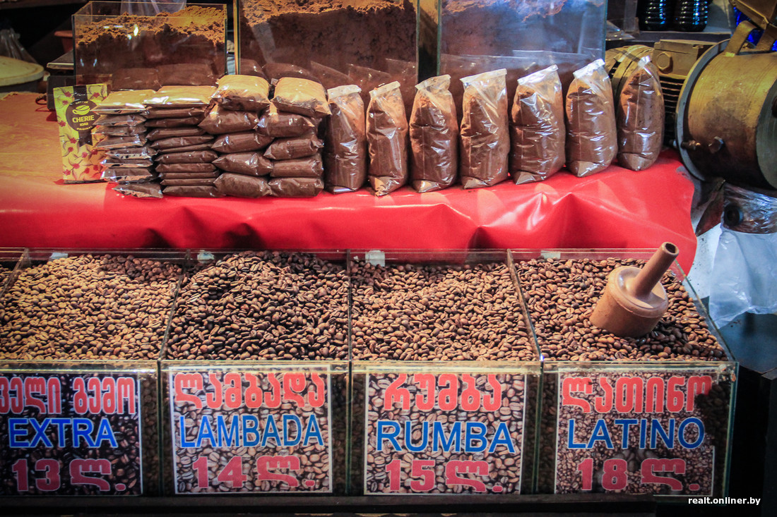 Торговаться не принято — итак все дешево. «Колбаска» чурчхелы — 1—3 лари (0,7—2,3 рубля), пастила — 1—2 лари (0,7—1,5 рубля), специи — 2 лари (1,5 рубля), кофе — 2—3 лари (1,5—2,3 рубля), аджика — 2 лари (1,5 рубля).