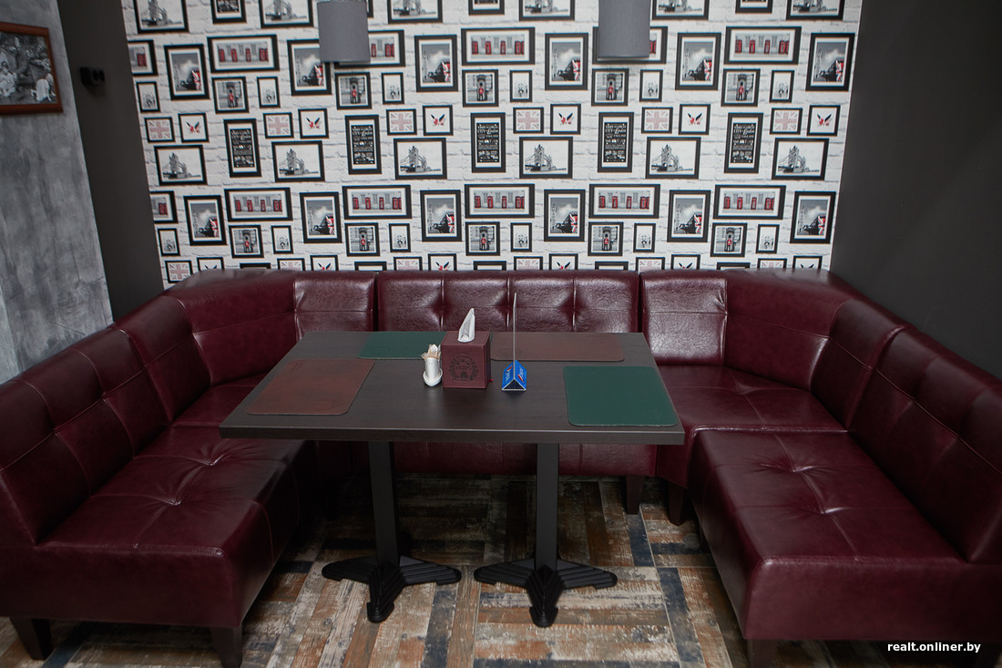 Оформление интерьеров отсылает к классическим английским пабам. Правда, некоторые места кажутся пустоватыми — дизайн будет дополняться деталями. Предлагаются места как на стульях, так и на мягких диванах.