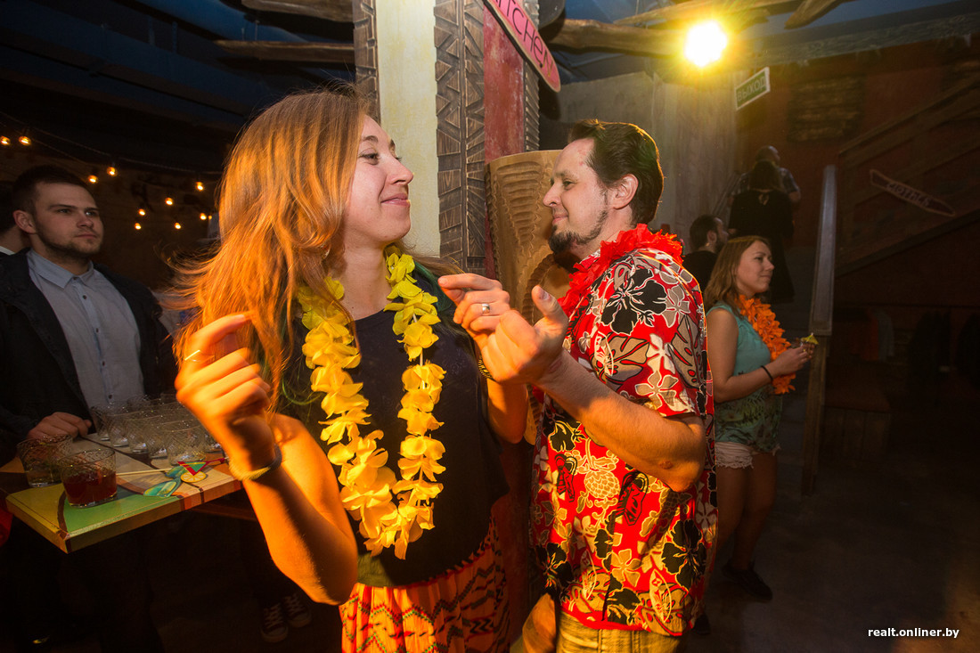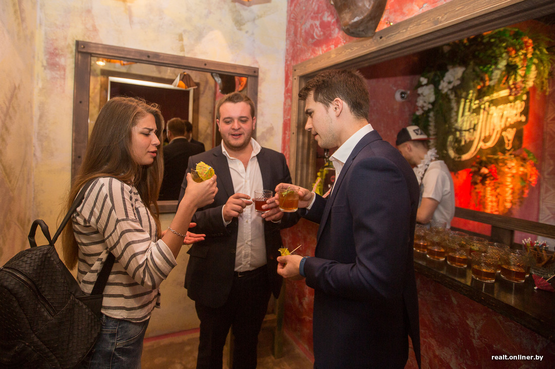 Вчера в бар пускали только по пригласительным, но уже к началу мероприятия кокосу негде было упасть. На входе посетителей угощали бесплатными коктейлями, музыканты били в барабаны, в центре зала зажигали темнокожие танцовщицы.