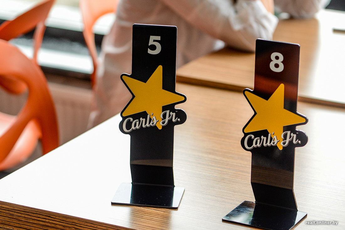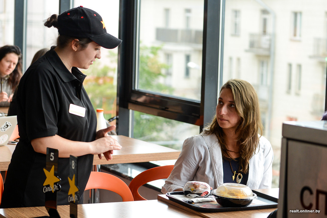 В Carl’s Jr работают три кассы. Сделав заказ, не нужно ждать его не отходя от кассы, раздражая тех, кто стоит в очереди. Клиент получает номерок, садится за стол и ждет официанта. Кроме того, услужливый персонал в фирменной черной одежде будет периодически подходить, интересоваться, все ли понравилось, и предлагать подлить напиток.
