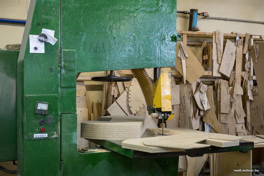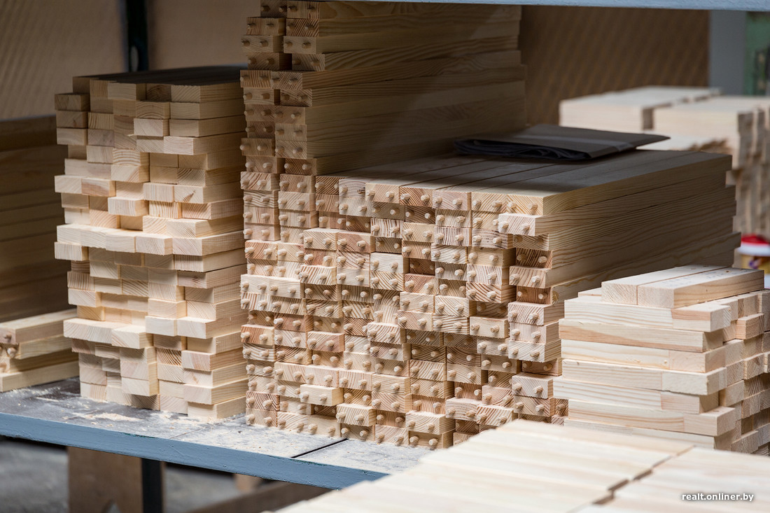 Каркас может состоять из десятков больших и маленьких частей. На шумном производстве под твердыми взглядами серьезных мужчин заготовки распиливают и отправляют на ленточный станок, где их превращают в детали, а затем складывают группами и отдают на участок сборки.