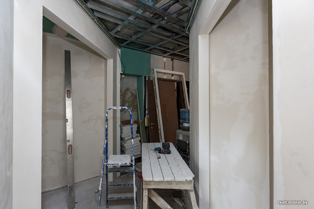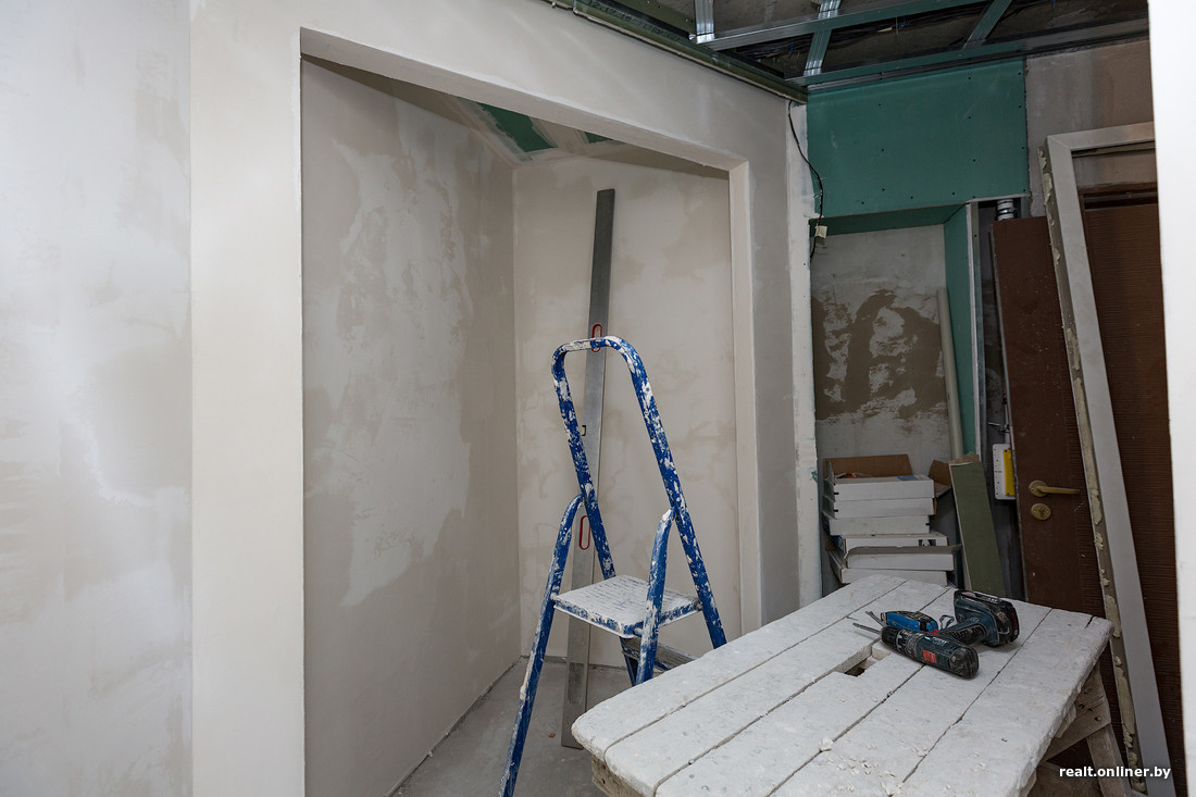 90-метровая квартира, которая в результате поиска оптимальных решений и параметров приобрела сложные формы, безусловно, изменила свой облик по сравнению с прошлым визитом. Но все же сдача объекта еще не просматривается. Пока наиболее близкими к финальной стадии являются спальня, гардеробная, кабинет и дальняя часть коридора. Стены здесь находятся в процессе шпаклевания.