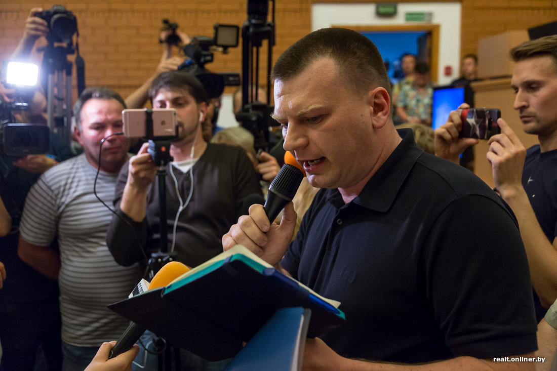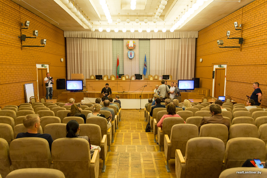 Главный архитектор проектов УП «Минскградо» Александр Бондарчик наконец пытается начать презентацию (практически через полчаса после начала). Из-за продолжающихся разговоров разобрать слова почти невозможно.
