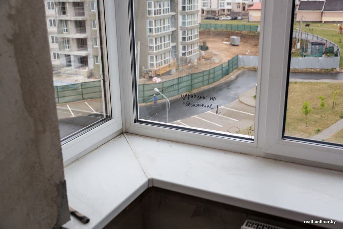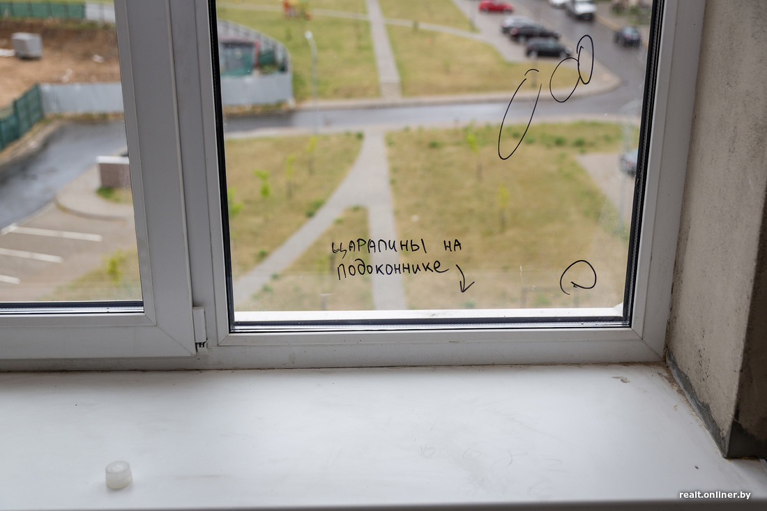 Окна жилых комнат имеют нестандартную угловую форму и дают много света. С откосами придется поработать: они не совсем ровные, а в отдельных местах неправильно развернуты. Некоторые подоконники поцарапаны. Со стеклопакетами беда: найти живой — настоящая проблема, царапинок и точек просто уйма. Хозяйка имеет право требовать замены всех «искалеченных» экземпляров, но некоторые недочеты могут показаться ей некритичными.