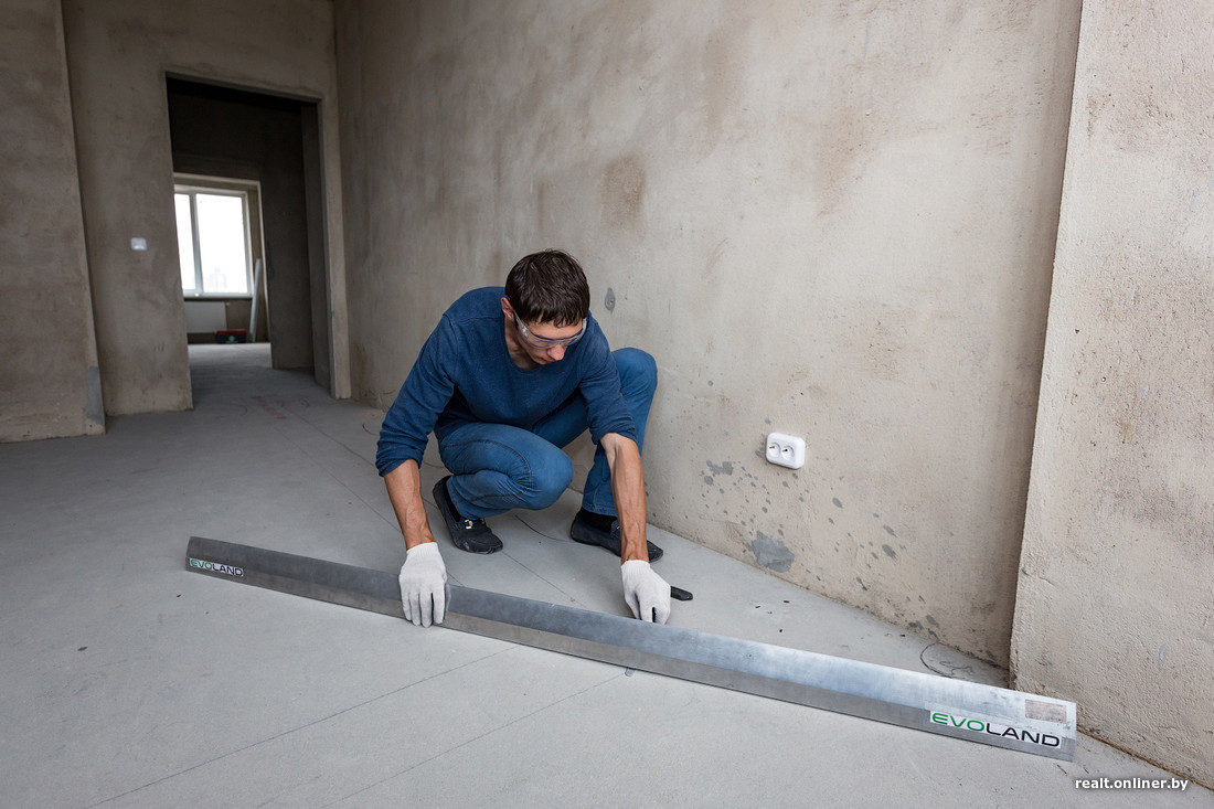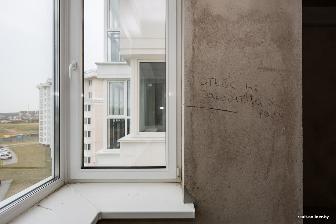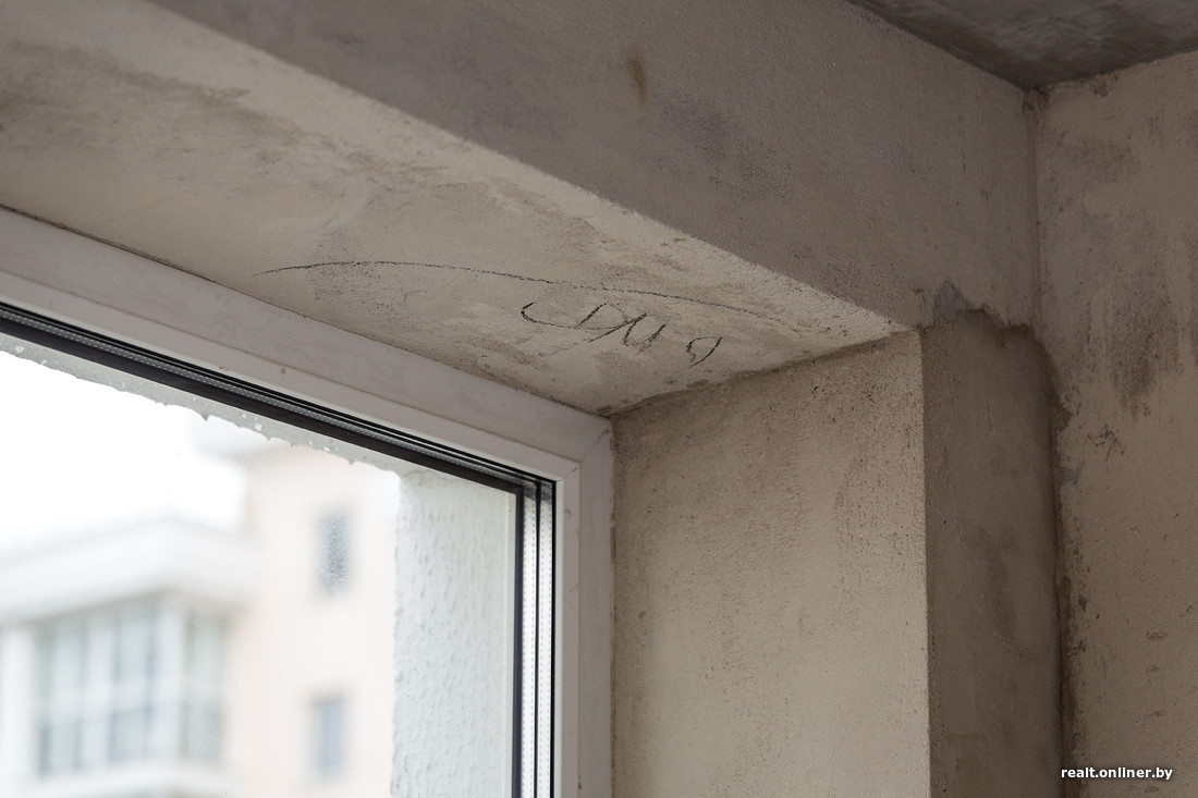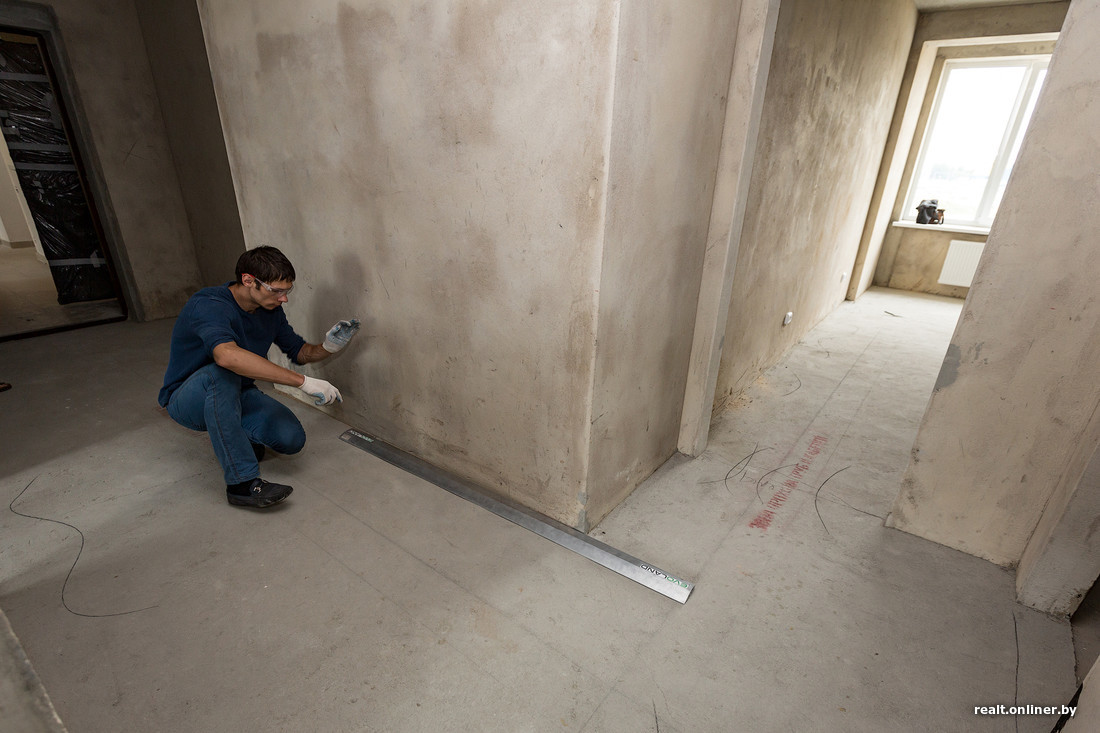 Специалисты пекинско-минской компании сделали большое и важное открытие на белорусском строительном рынке (к сожалению, их примеру никто особо активно не следует). Оказалось, что для облегчения участи новоселов и их ремонтных бригад можно отмечать в полу места прохождения труб отопления и кабелей. Соответствующие надписи и приблизительные контуры есть во всех помещениях квартиры. Очень удобно. Но что скажут специалисты по приемке, которые уже успели «расчертить» квартиру и обозначить проблемные места?