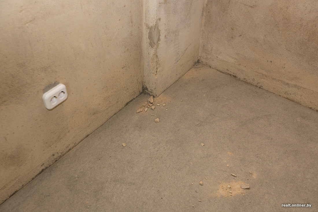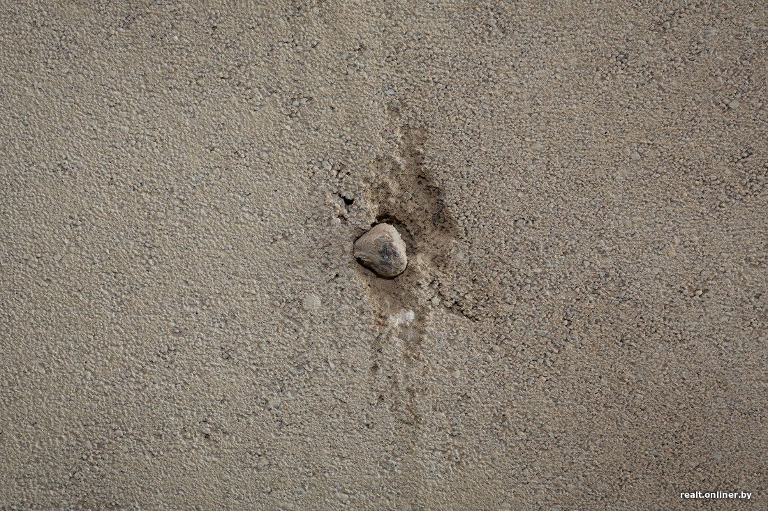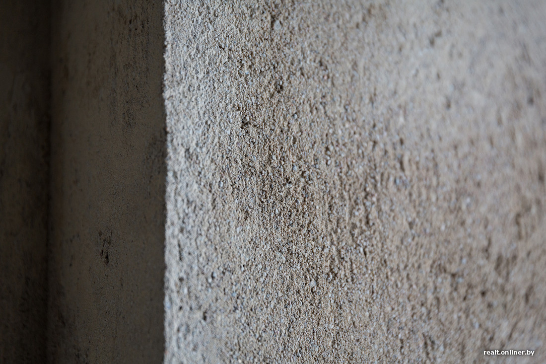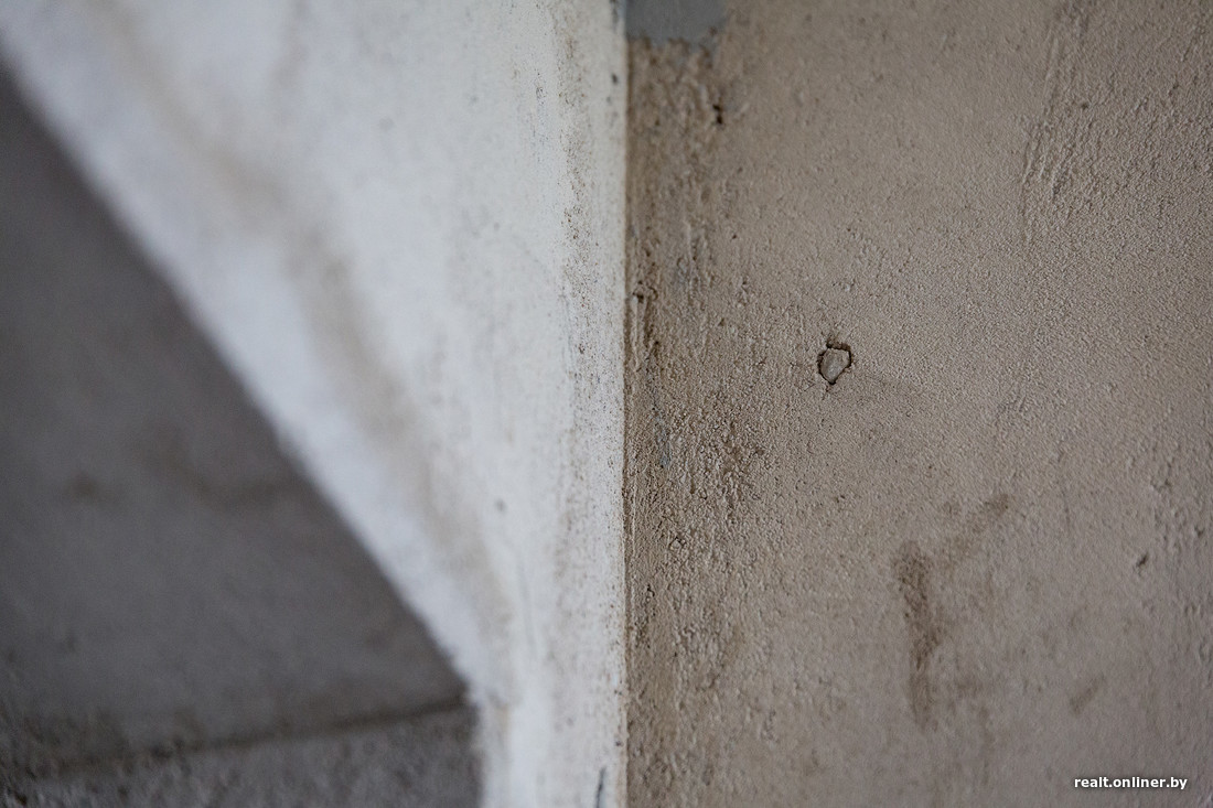 По стенам ничего плохого сказать не могу: есть буквально несколько мест неприлегания штукатурки, их надо будет сбить и переделать. Но вот выполнено все совершенно по-другому, непривычно. Посмотрите хотя бы на перетирку стен: у нас поверхности после этого этапа остаются гладкими, не сильно бросаются в глаза какие-то камешки. Здесь же во всей квартире есть только одно небольшое место, которое похоже на «белорусский почерк». Все остальные поверхности — грубые. Видны достаточно большие камни: наверное, песок тщательно не просеивается и перетирка идет не такая скрупулезная.
