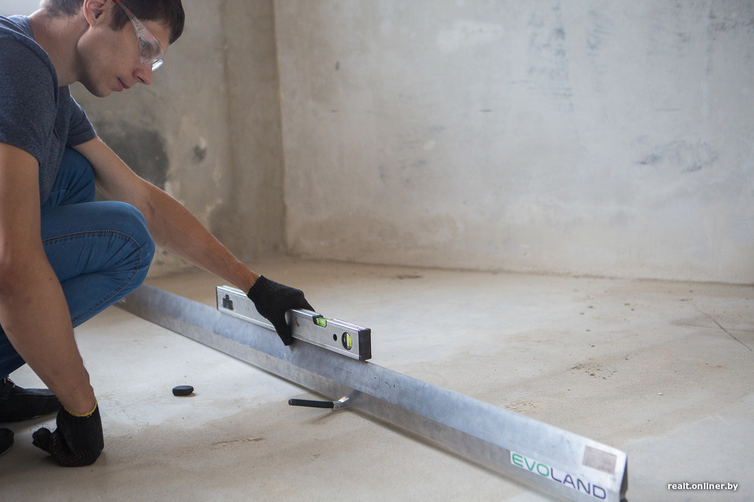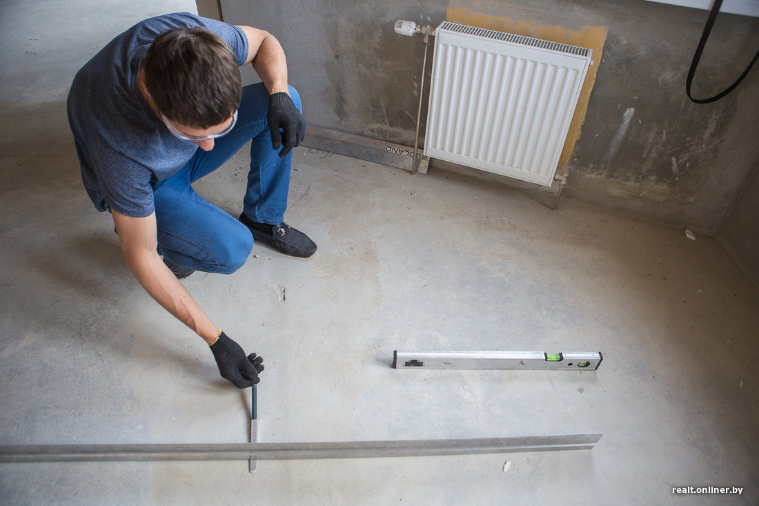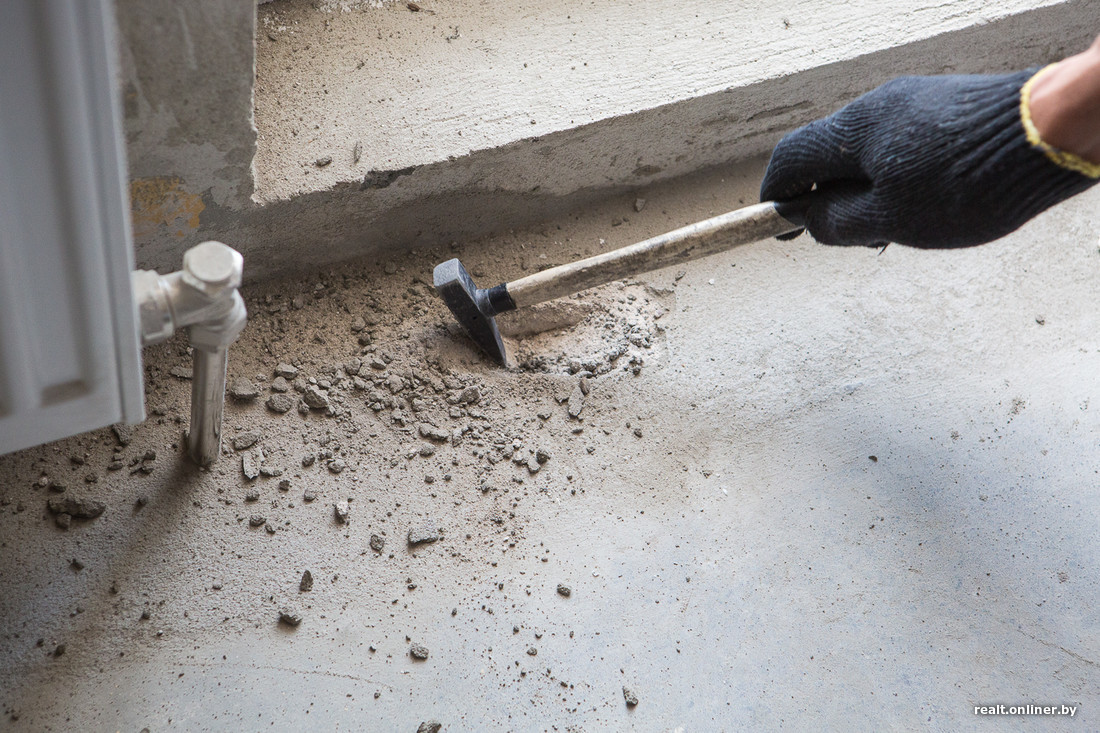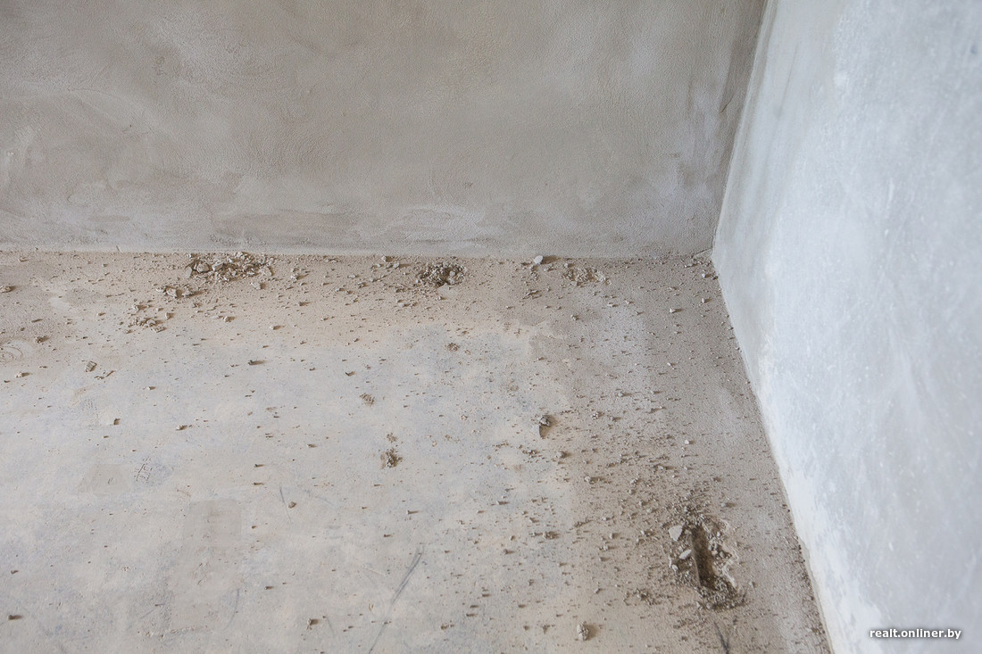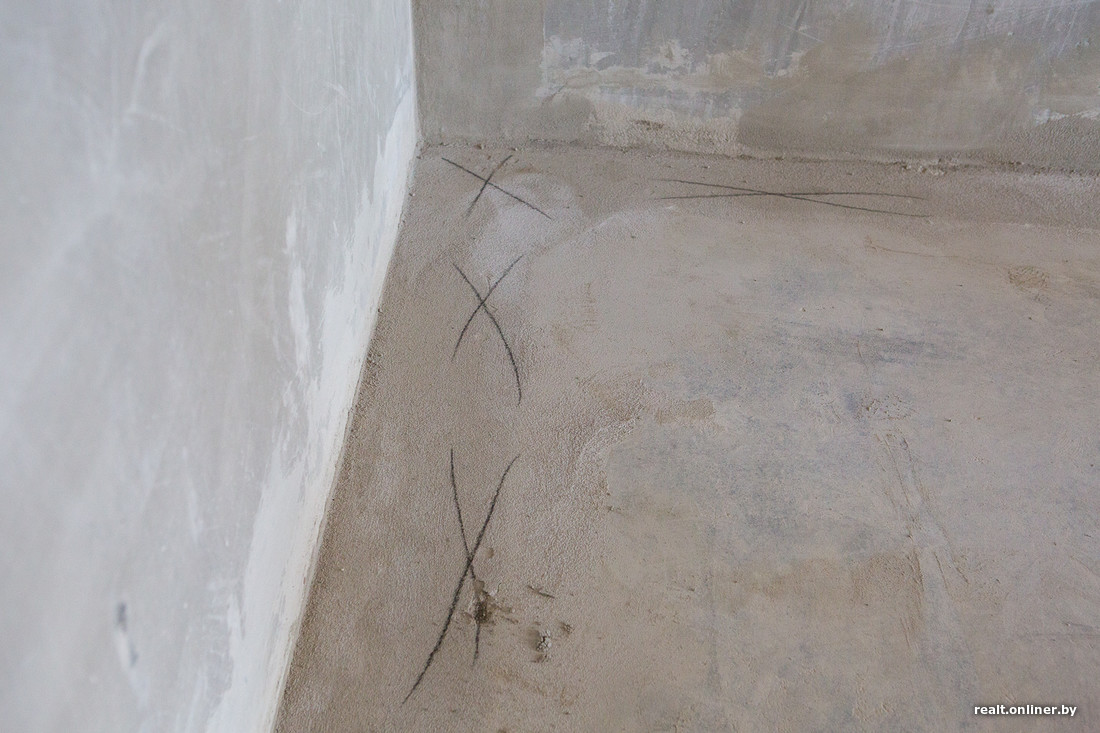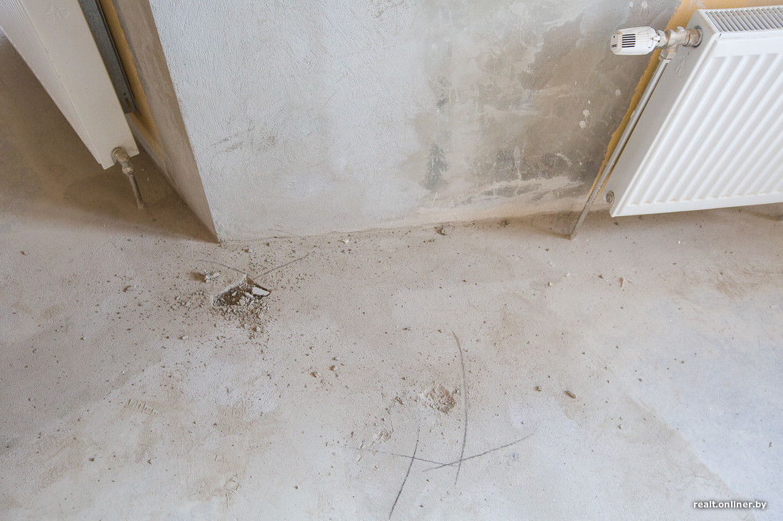 — Немало вопросов по стяжке, — продолжает осмотр специалист компании «Эво Лэнд». — Во-первых, по периметру комнат, там, где лежат трубы отопления, раствор не держится. В принципе, это известное больное место таких домов: после укладки труб пустое пространство заделывают «перегоревшим» раствором или вовсе непонятно каким составом (посмотрите на этот «песок»: смесь должна быть серой, а не белесой). Доливка стяжки не удалась и по уровню — вдоль почти всех стен образовался бортик. Пусть с этими проблемами разбирается застройщик. Состав надо изъять и залить новый, причем вровень с плоскостью пола, а если бортик образуется снова, то сошлифовать.
