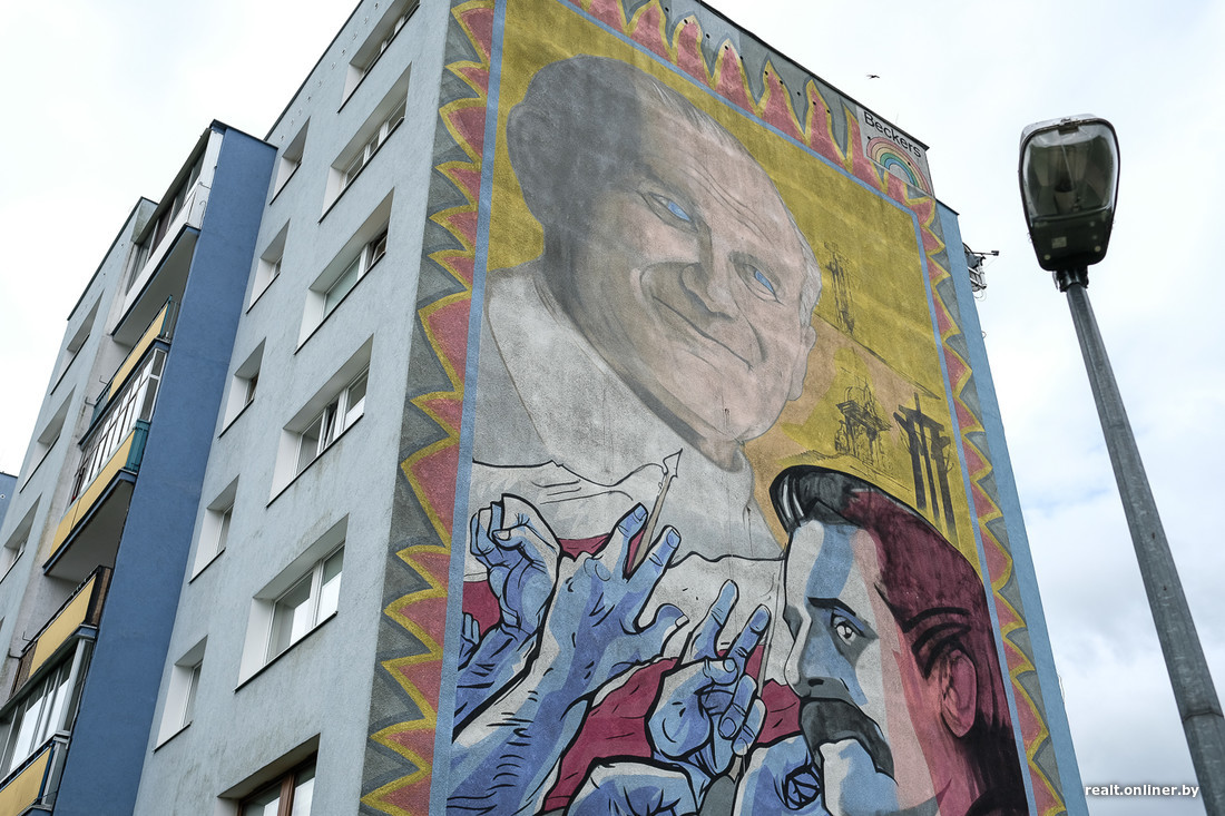 Встреча двух самых известных поляков конца XX века стала сюжетом и для первого из шести десятков местных муралов. Для Гданьска и Заспы 1990-е были действительно лихими. Стремительное наступление капитализма, связанные с этим жесточайшие проблемы местных предприятий, закрытие верфей, увольнения и сокращения изрядно добавили депрессии в повседневную жизнь района. Попыткой внести немного оптимизма в унылые будни Заспы стал арт-фестиваль, организованный в 1997 году и приуроченный к 1000-летию Гданьска. В ходе него боковые фасады многоэтажек украсили десять монументальных художественных работ, первой из которых и был рисунок Рафала Росковиньского, изобразившего пару поляков, изменивших судьбу страны.