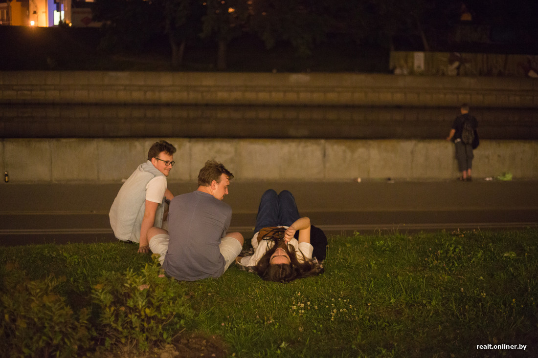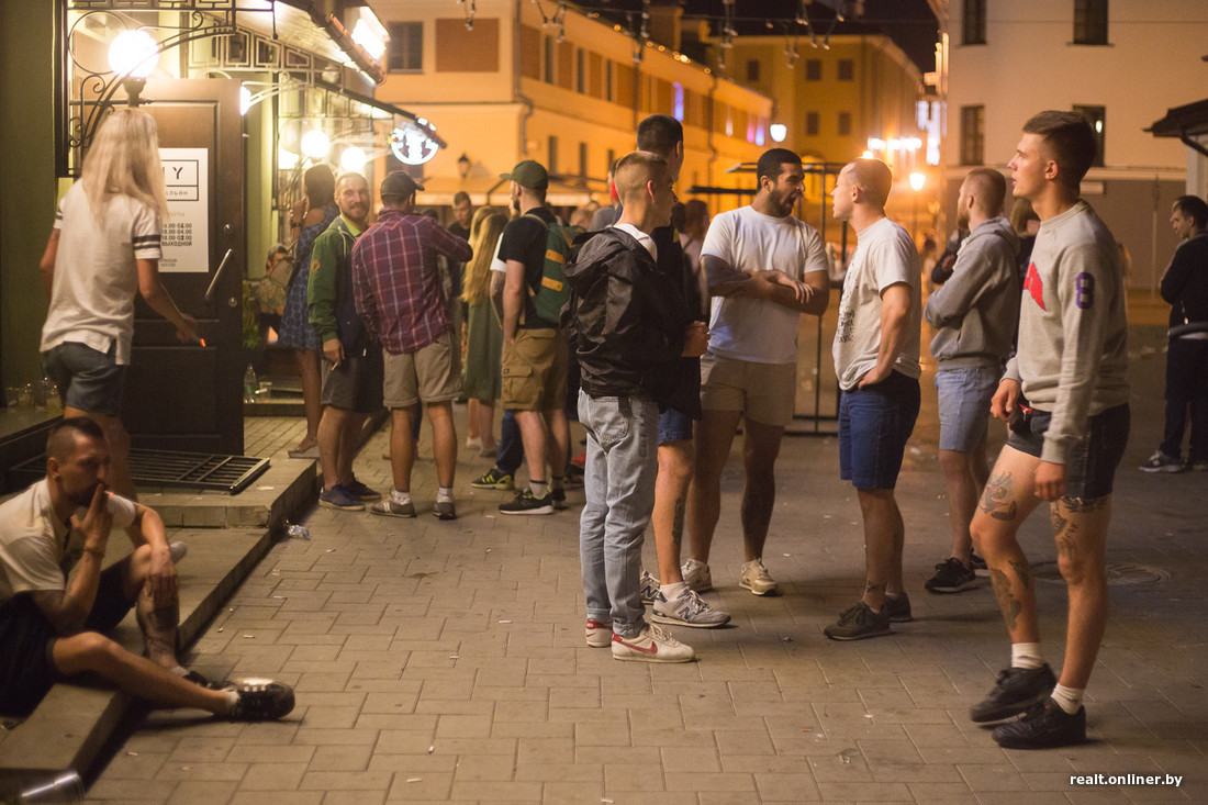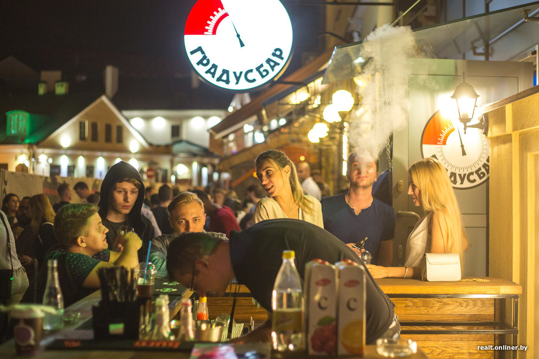 В прошлую пятницу фонари на улицах города погасли в 4:52, и Минск начал готовиться к продуктивному утру. Но молодые люди в тусовочных местах пока и не думали гаснуть — по крайней мере, ждали до последнего. Летом минчане хотят видеть ночь и гулять до утра, и питейные заведения им в этом помогают. Onliner.by посмотрел, как проходит обычная пятничная тусовка на Зыбицкой, Революционной, Октябрьской и Кульман.