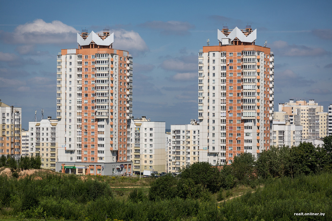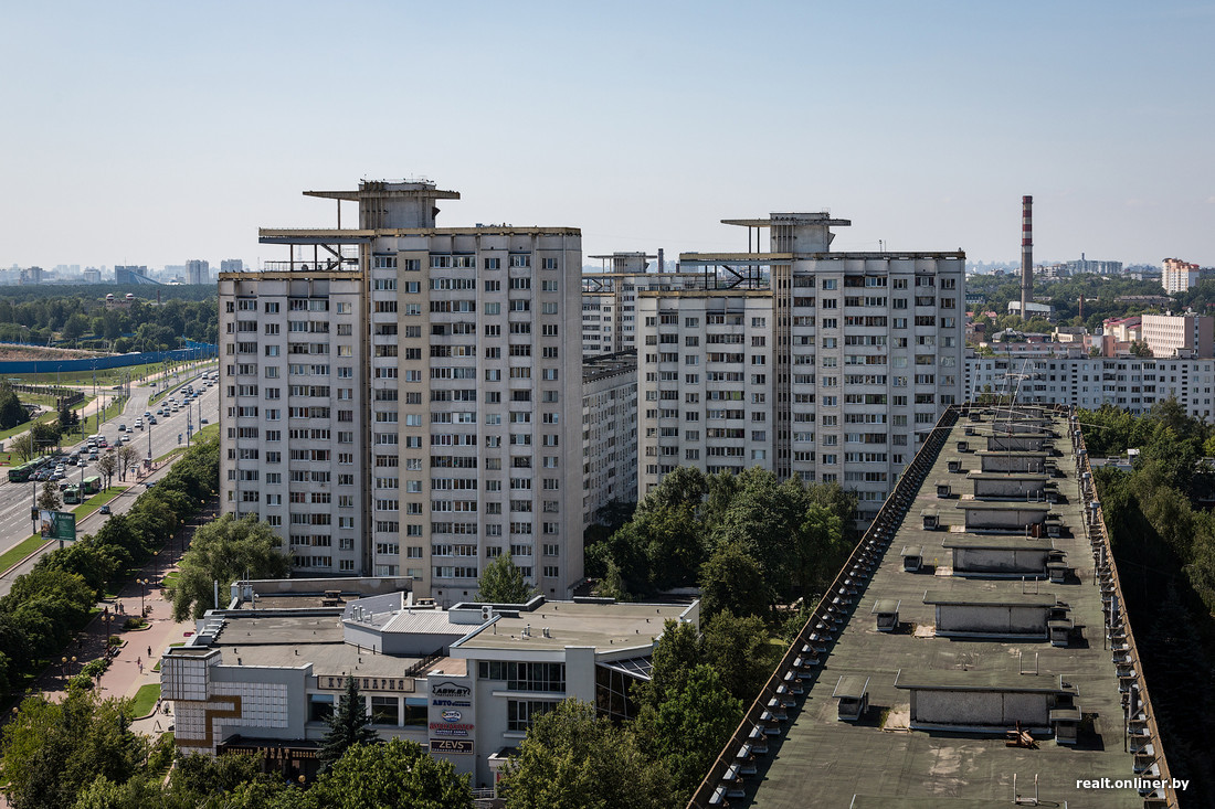 В конце семидесятых годов на востоке города появилось два чудесных дома с мозаикой на фасаде, которая недавно решила, что ей пора. Тогда в Минск массово перевозили людей из деревень, чтобы решить проблему слабой заселенности. Деревенские ехать сюда не шибко стремились: ни тебе грядок, ни возни в огороде, ни экологически чистой картошечки. Тогда мудрые советские архитекторы придумали гениальный план: оформить грядки прямо на крышах высоток. Эксперимент удался, и люди вплоть до девяностых годов выращивали помидоры максимально близко к редкому минскому солнцу.