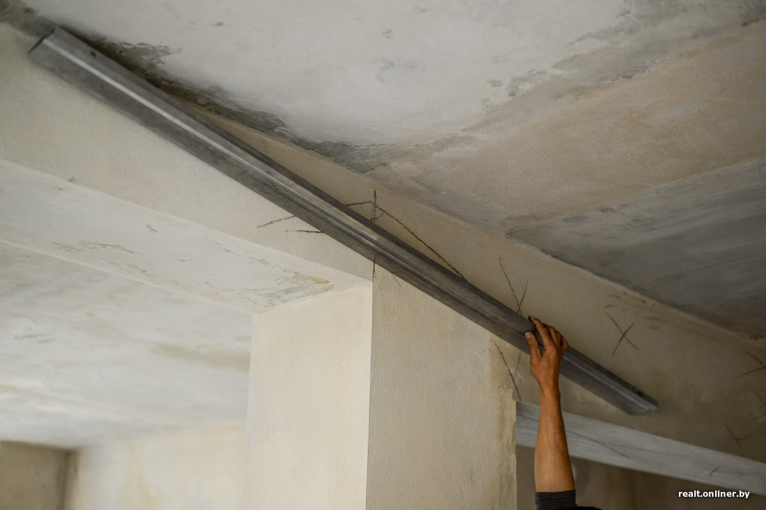 — Еще один неприятный момент также связан с колонной и лежащей на ней балкой: конструкция кривая. Если пытаться провести прямую из одной части квартиры в другую вдоль балки, то придется нарастить на нее сантиметров семь в районе окна — иначе ровности не добиться. Когда хозяева не разбивают квартиру на отдельные помещения, это незаметно. Но если есть желание изолировать кухню от жилой комнаты, проблема проявится. По потолку этот своеобразный перелом будет виден четко.