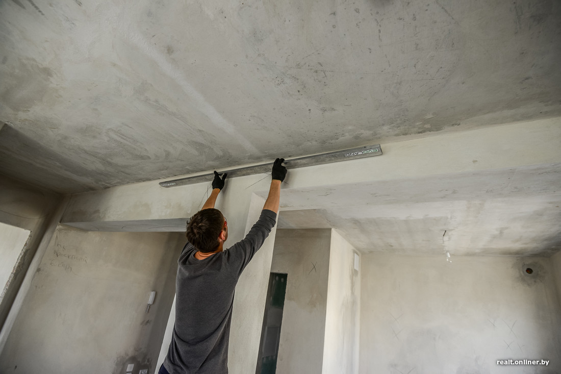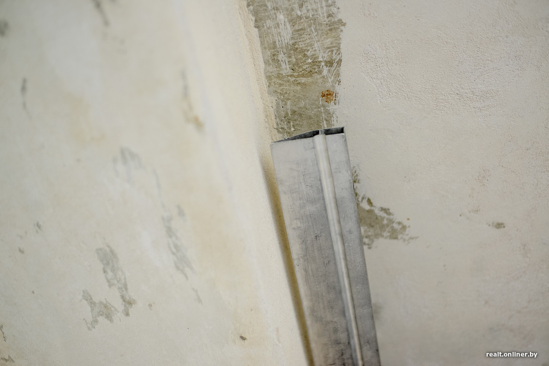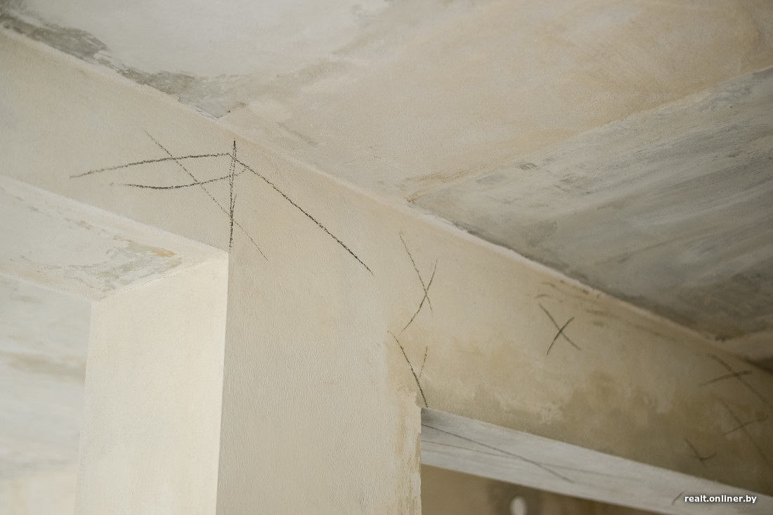 — Дом необычный. При строительстве применялась комбинированная система: монолитная часть потолка в одной половине квартиры соединена с железобетонными плитами перекрытия в другой. Условно говоря, «двушка» делится на две половины: кухня, туалет и часть коридора накрыты обыкновенной пустотной плитой, а жилые комнаты заливались, как это принято в «каркасниках». Этот факт надо сразу учитывать: штукатурить потолок в той части, где идут плиты, бессмысленно, так как трещины будут появляться снова и снова. Поэтому лучше будет сразу либо натянуть потолок, либо сделать его из гипсокартона, чтобы потом не расстраиваться. А вот с монолитным потолком можно экспериментировать: выравнивать при помощи штукатурки, шпаклевать, — предупреждает Александр Скок.