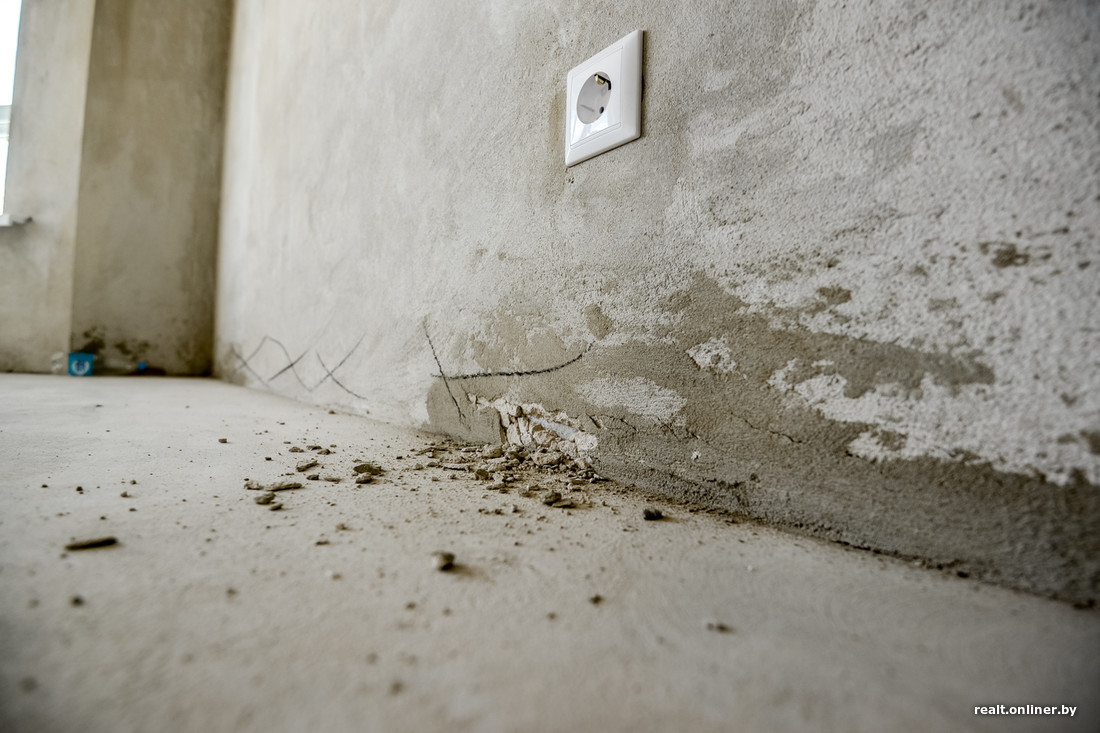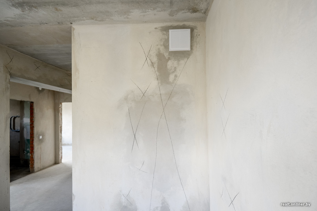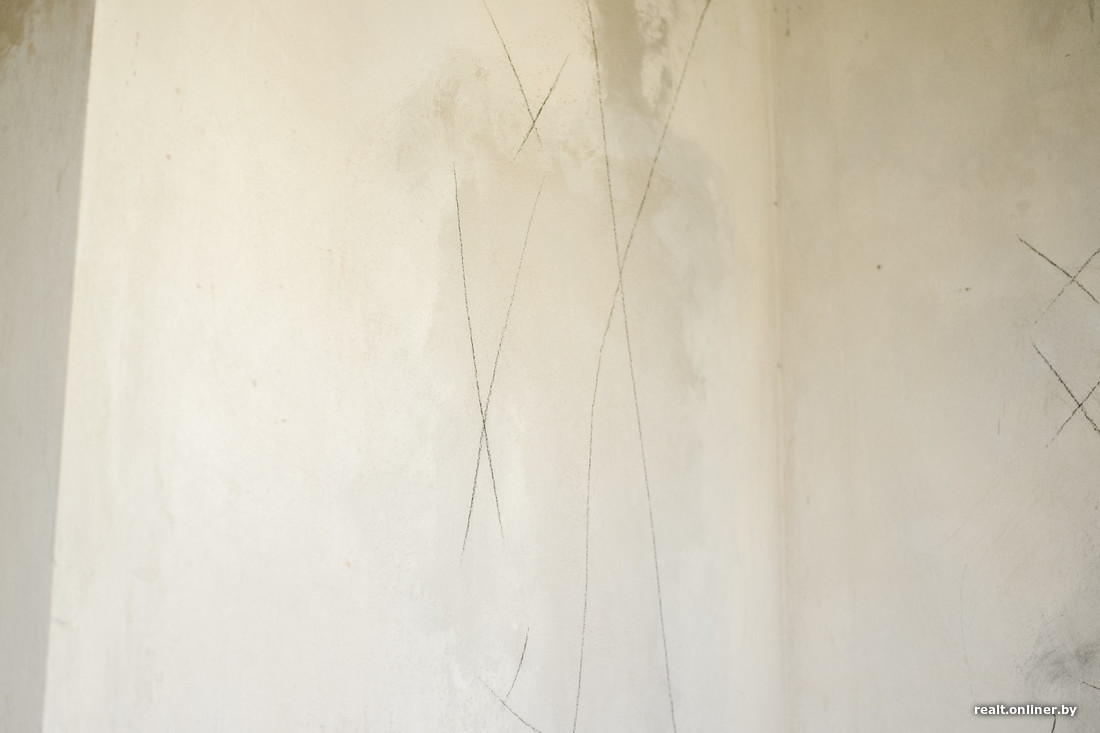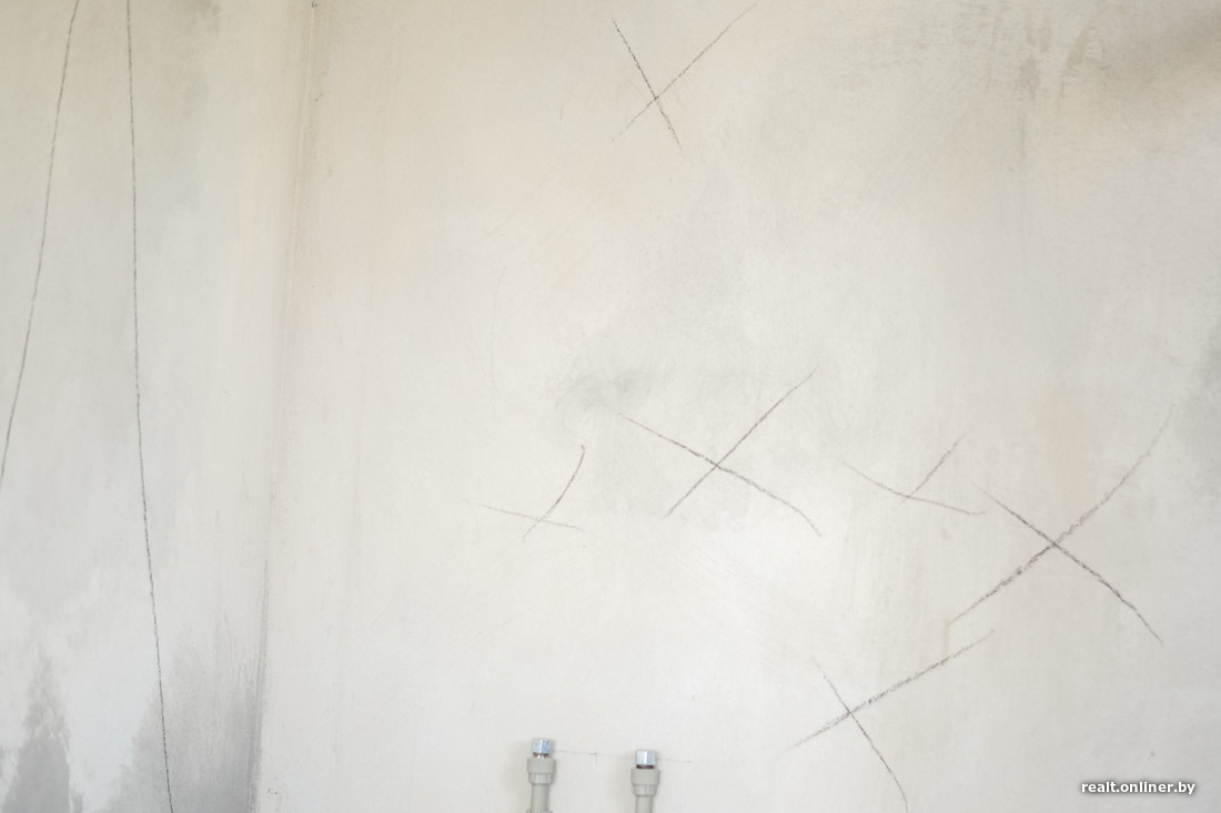 Стены в квартире не плохие и не хорошие. Есть погрешности как с плоскостью, так и с прилеганием штукатурки. Но они некритичны, все поправимо, причем довольно просто. Наибольшая концентрация проблем — на центральной колонне: штукатурка совсем не хочет держаться на ней, есть отклонение по вертикали.