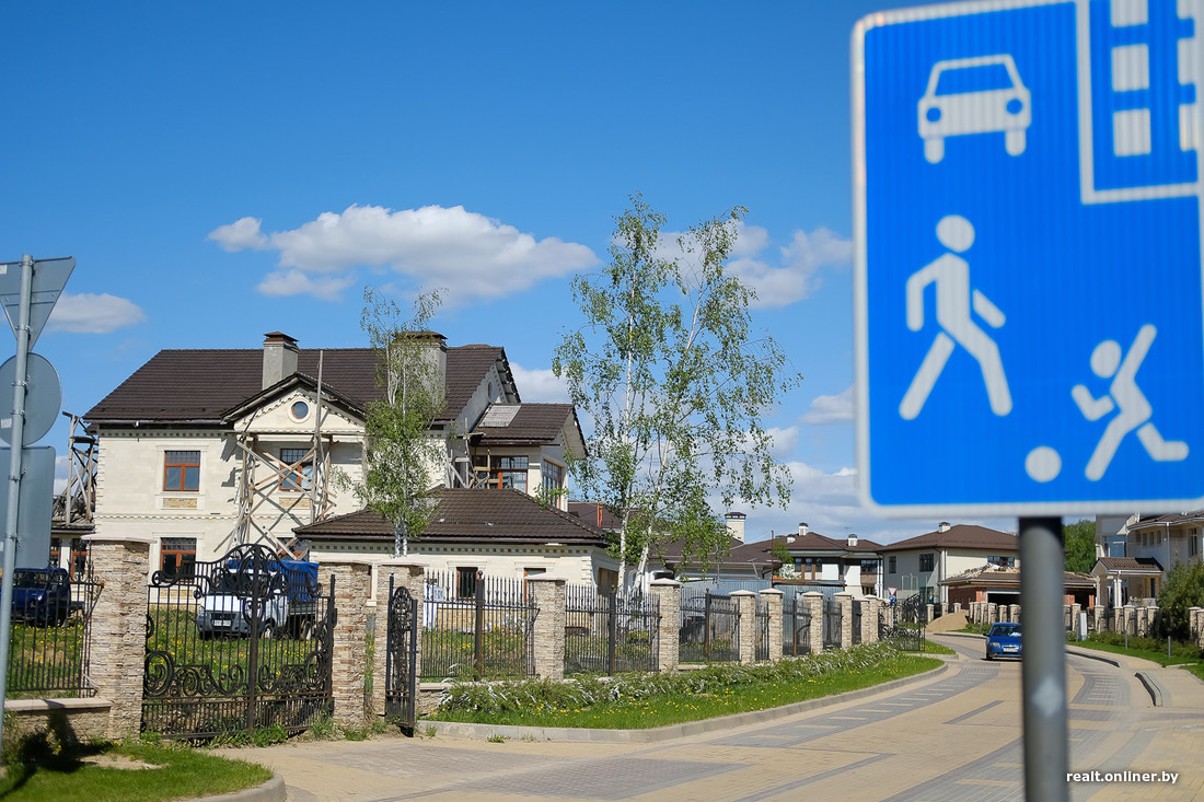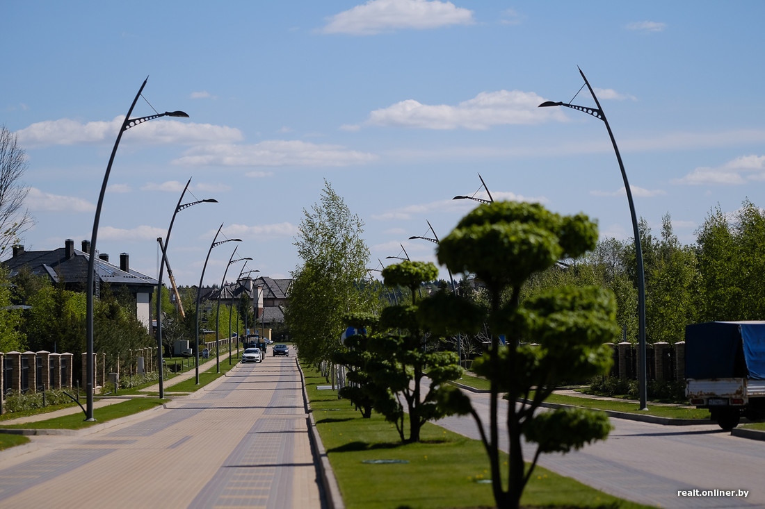 Дороги выполнены на монолитной основе и покрыты брусчаткой. Обращают на себя внимание и невысокие заборы с живыми изгородями со стороны фасадов. Такой подход здесь также принят за стандарт. Улицы воспринимаются как зеленые коридоры, а не тоннели из металлопрофиля и бетона, как это нередко бывает на Рублевке.