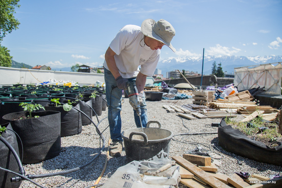 — Тут соединяется система опор, то есть несущих столбов и балок, — поясняет Виктор. — Это обычная строительная система. Большой объем земли позволяет выращивать на этих стенах практически любые растения, кроме тех, у которых очень развитая корневая система.