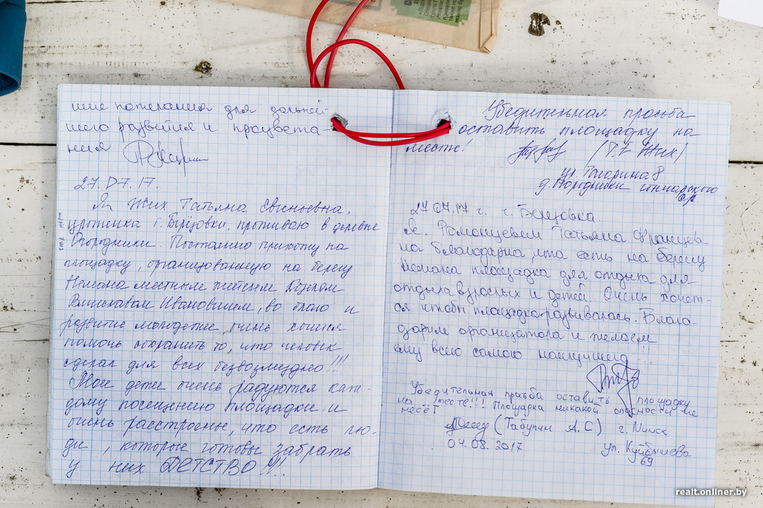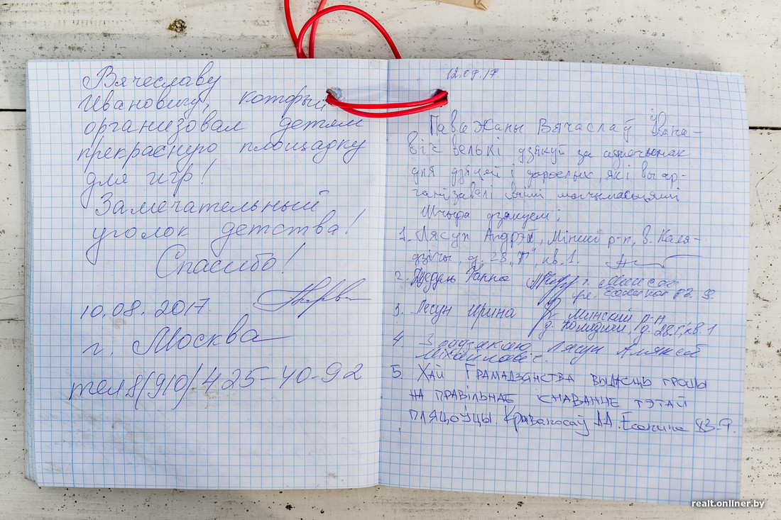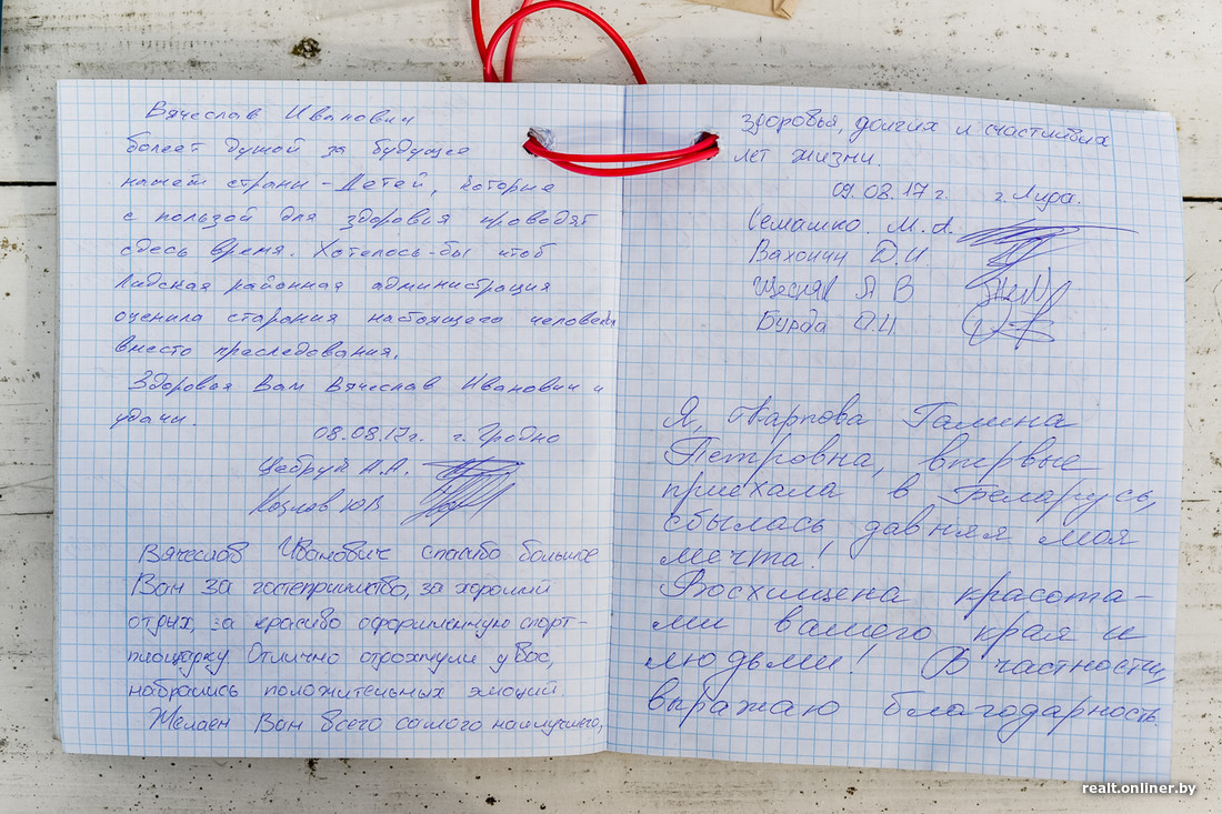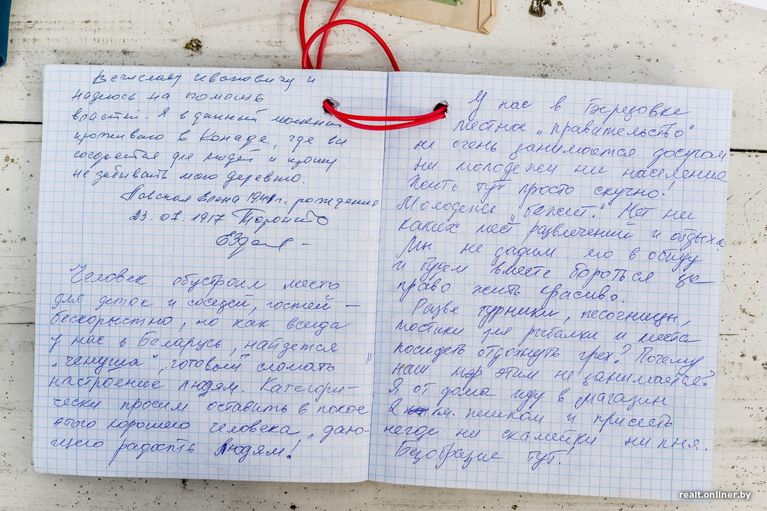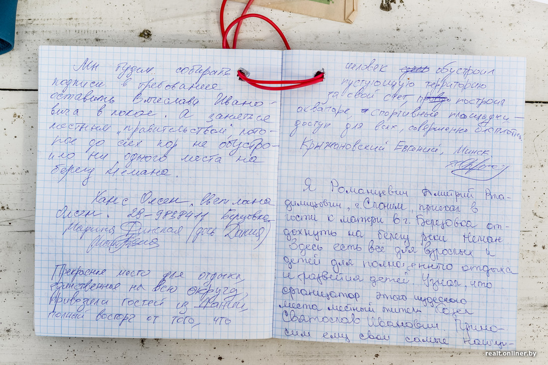 После суда люди подсказали: мол, плохо ты, дед Слава, подготовился. Надо было пройти по деревне, собрать подписи. С тех пор заведена специальная тетрадь. За полтора месяца в ней полсотни записей — от местных жителей, гостей из Лиды, Бреста, Гродно, Минска, Кемерово, Москвы. На каждой странице — благодарности за чудесное место отдыха, адресованные властям просьбы оставить пенсионера в покое. Если в руки судей и чиновников эти записи не попадут, то пусть будут опубликованы хотя бы здесь.