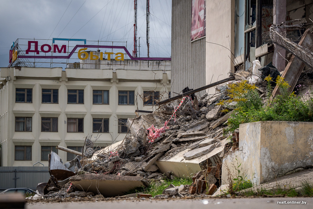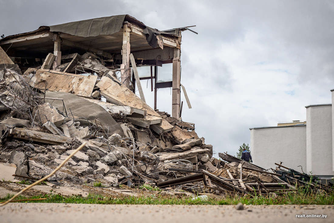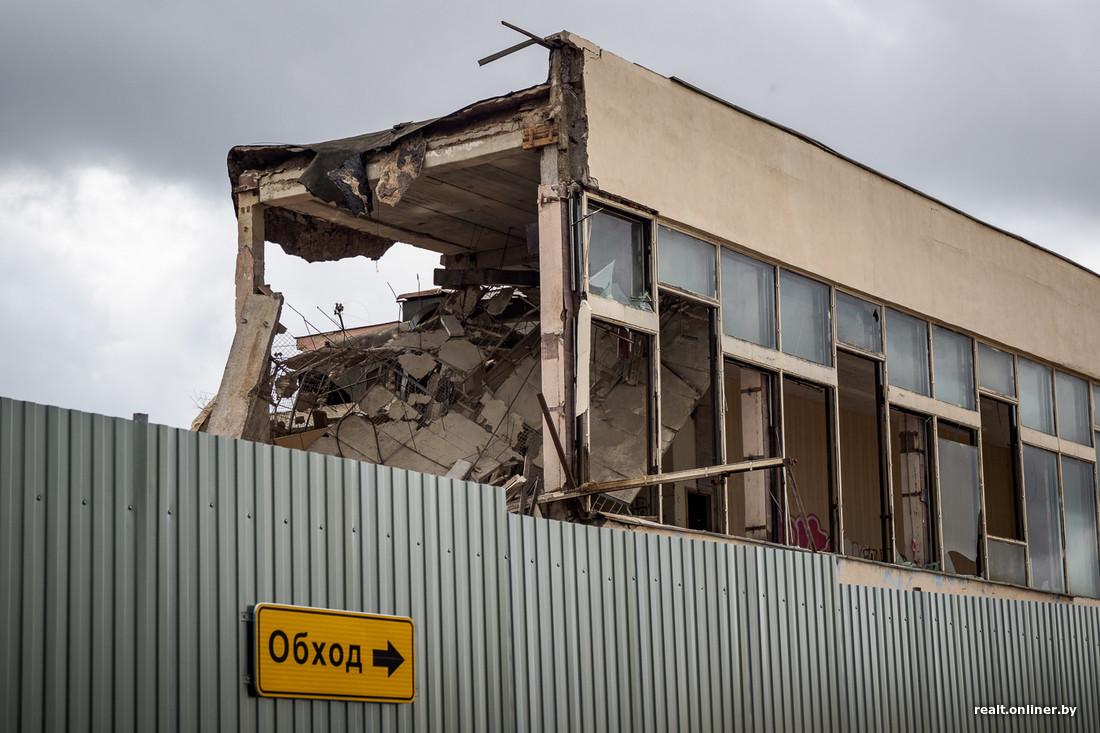 Сегодня понятно, что реконструкция ведется довольно своеобразно: здание попросту начали сносить. Примерно треть уже превратилась в обломки, работы продолжаются. Часть здания пока стоит, но выглядит аварийно.
