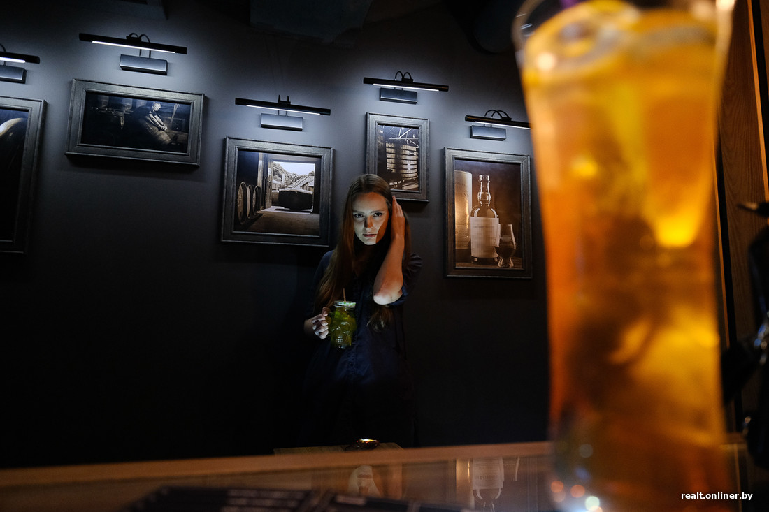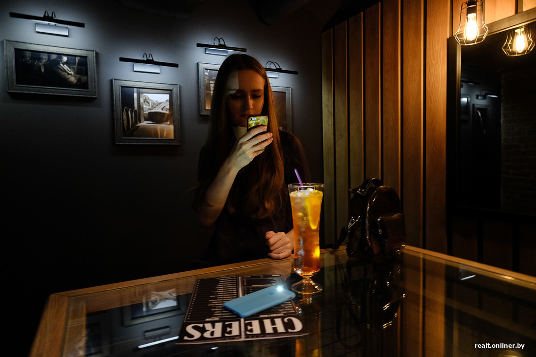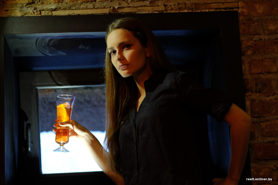 Любимый коктейль нашей модели — Aperol Spritz. Девушка сильно удивилась, узнав, что скоро в Беларуси ему не бывать: один из ингредиентов не прошел сертификацию. Но в Cheers оранжевый напиток пока есть. «Осталось три бутылки», — гордо говорит бармен. Стоит «Апероль» здесь 10 рублей.